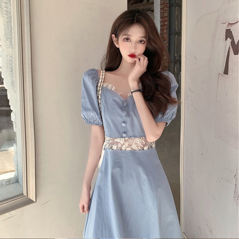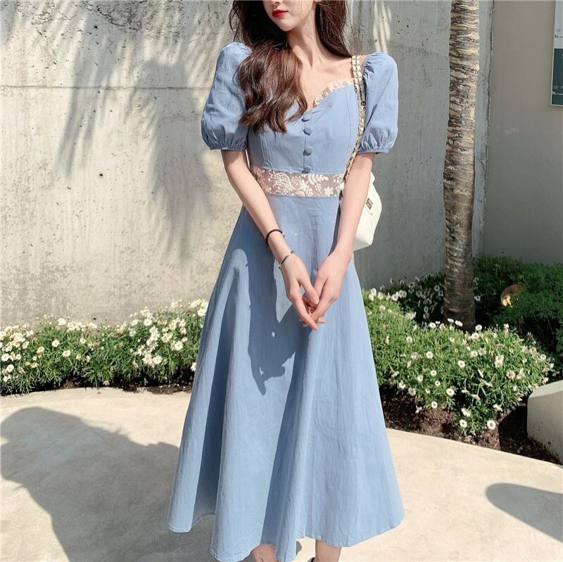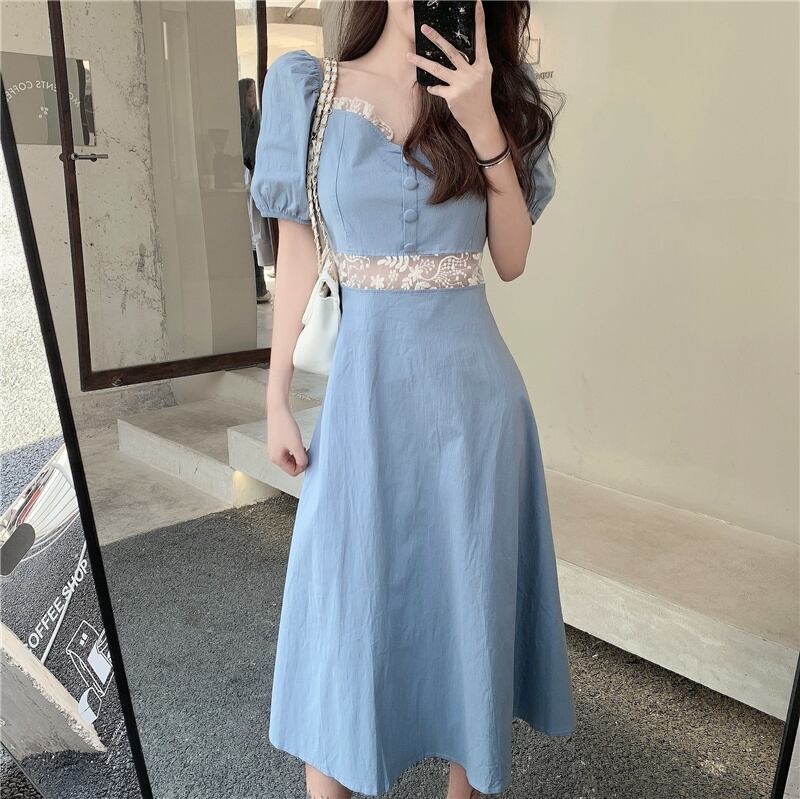 スタンダード薄手ロングレディース夏服カラーワンピース レトロ レース 夏物 スカート フラワーデザイン スクウェア ウエスト Marchs41747334517