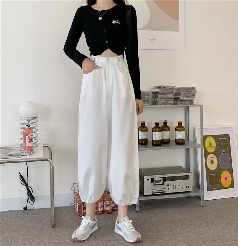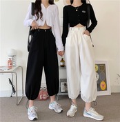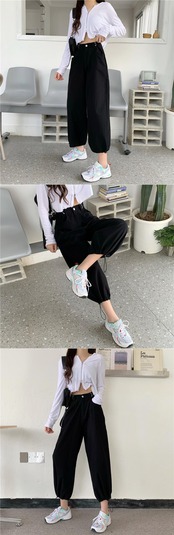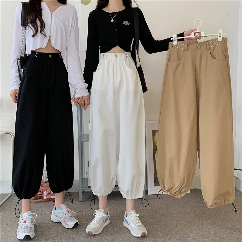 パンツ 夏服ハイウェストウェスト薄手ブラックギャザーカジュアルレディースルーズ 夏物 アジャスタブル ウエスト Marchs35830987072