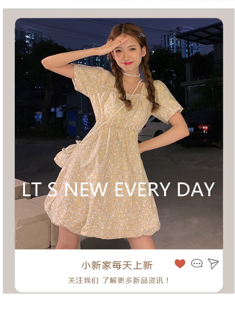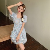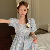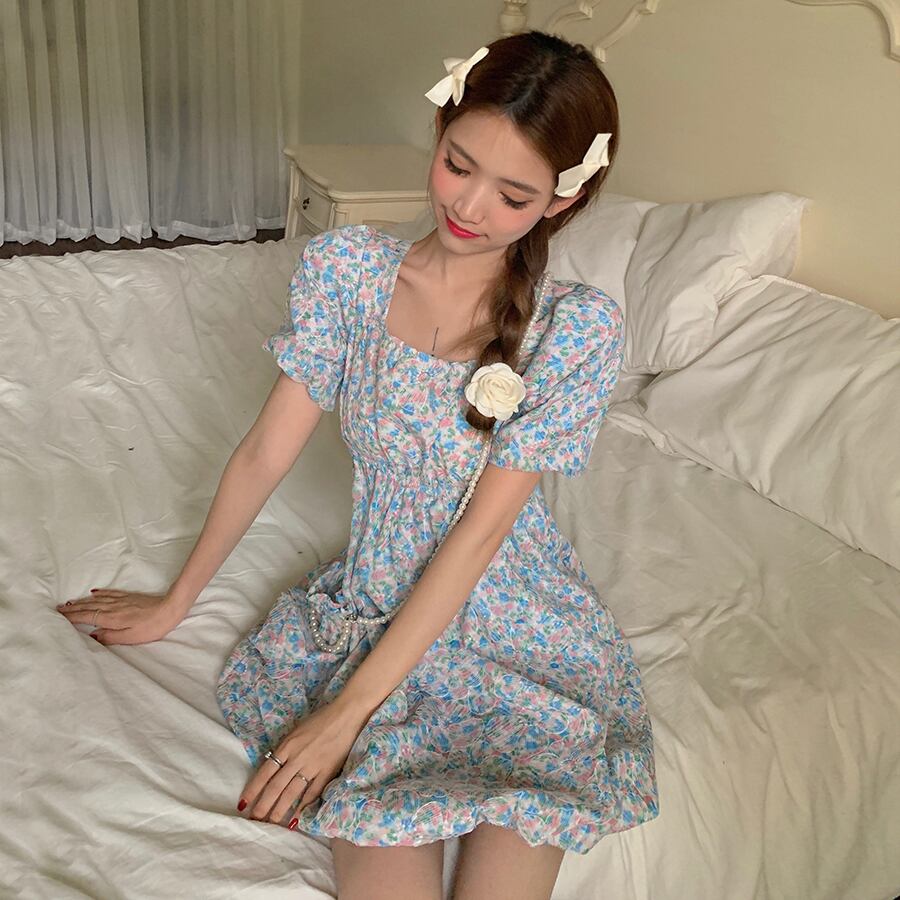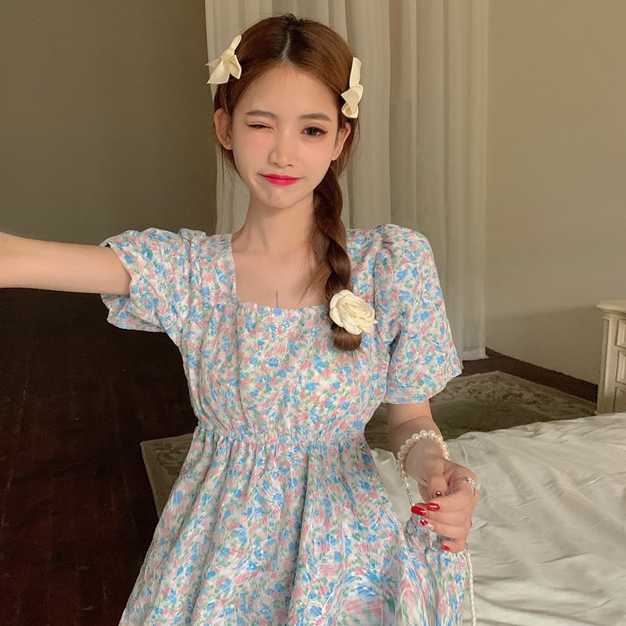 スタンダードカラースリーブフローラルAラインワンピースレディース レトロ 大人ガーリー スウィート キュート カジュアル 花柄 スクウェア Marchs16308854590