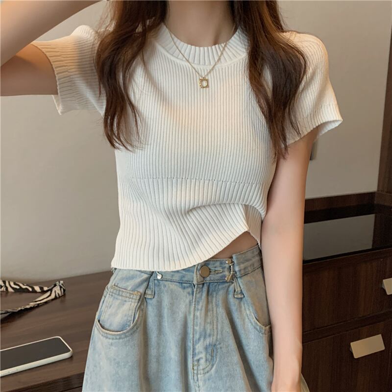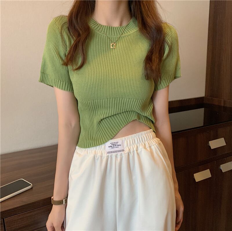 夏服ショートトップス ハイウェストウェストパンツ レディースニットセーター スリムグリーンTシャツトレンド 夏物 シルク ウエスト Marchs17168401836