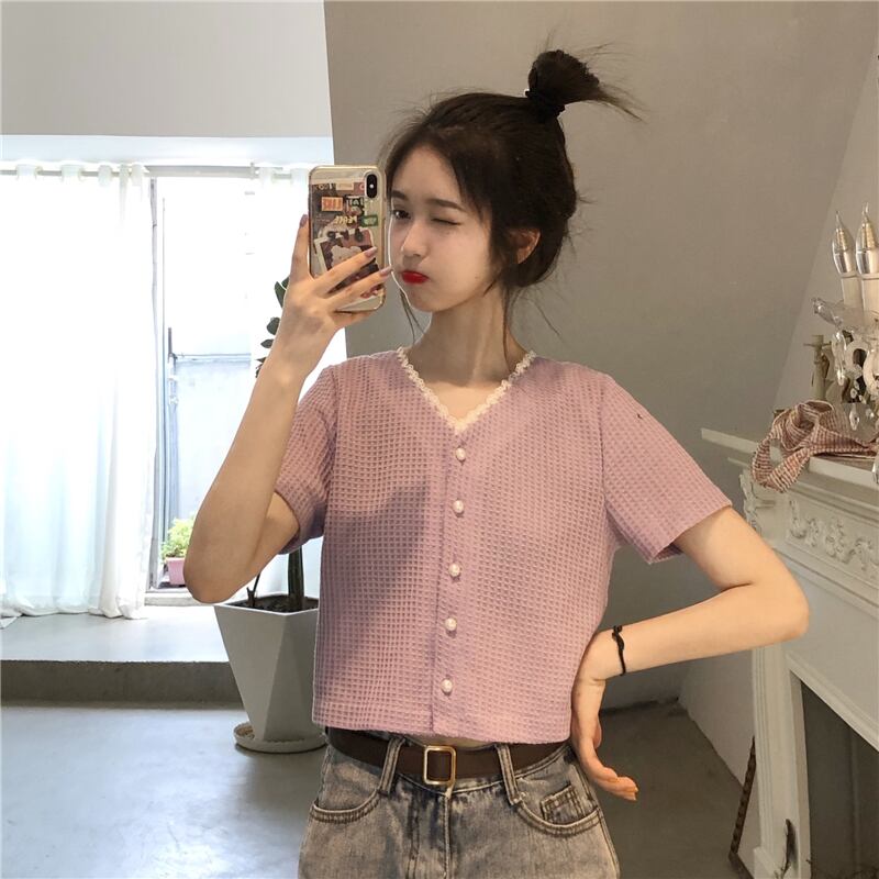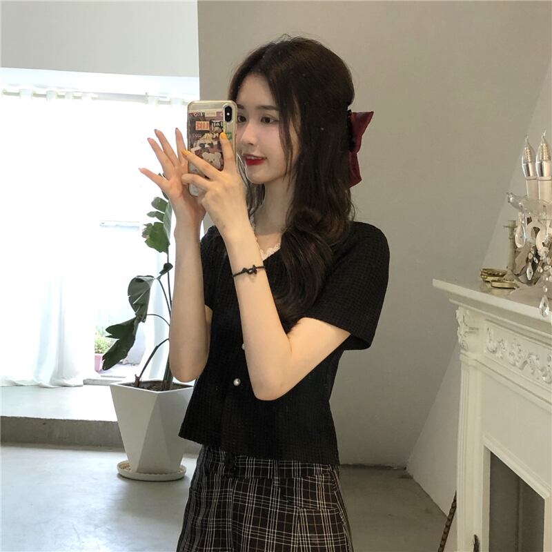レースVネックニットTシャツスリム薄手ブラッククロップドトップス ハイウェストウェストパンツ 夏服 夏物 ステッチ ウエスト Marchs93092805230