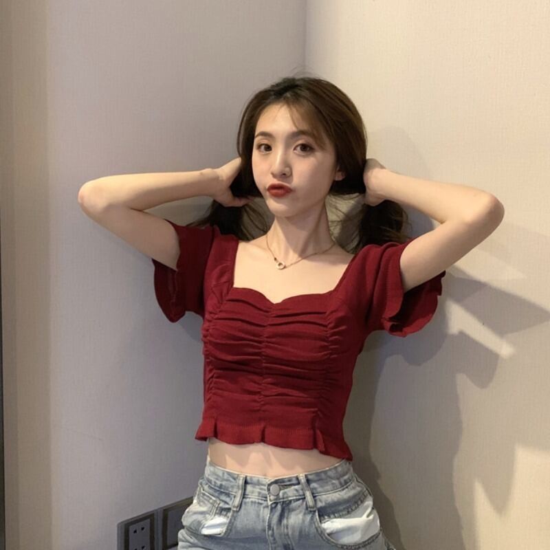 ブラックカラーTシャツスプリング夏服ニットクロップドスリムトップス 春物 夏物 スクウェア Marchs69683474051