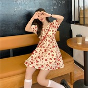 ワンピースウェストAライン夏服パフスリーブスリーブスカート レッドフローラル 夏物 花柄 パニエ ペチコート ウエスト Marchs77519395067