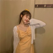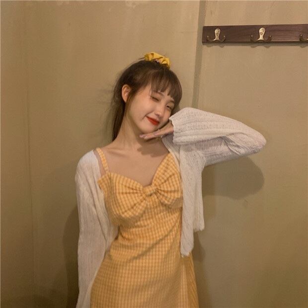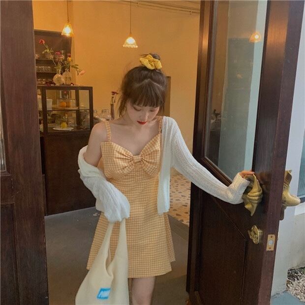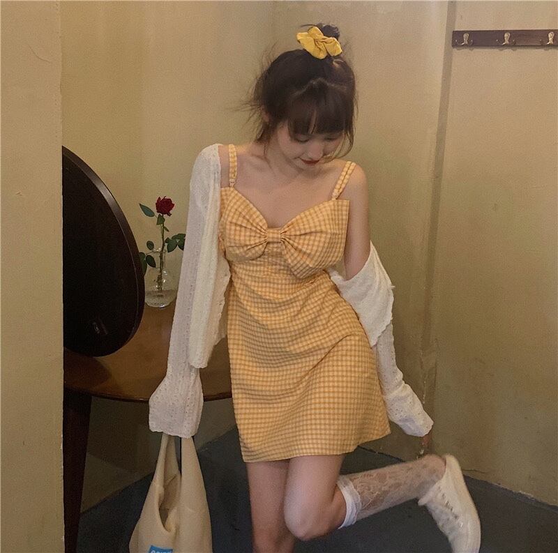 夏服スタイルスタンダードリボンイエロー格子柄ワンピースウェストスカート レディース レトロ 夏物 ウエスト Marchs52958568108