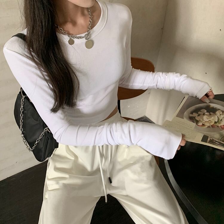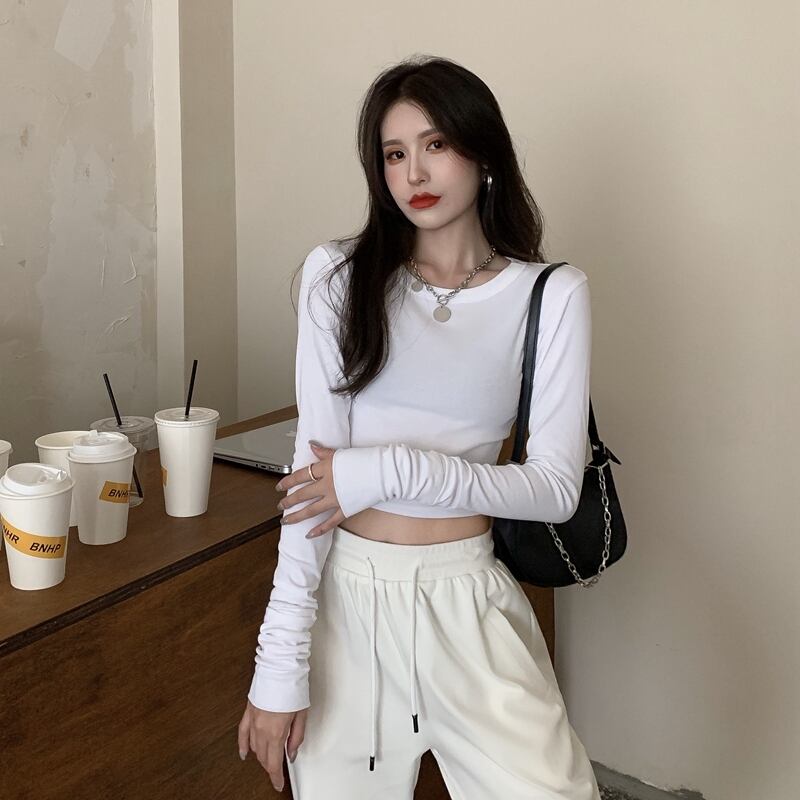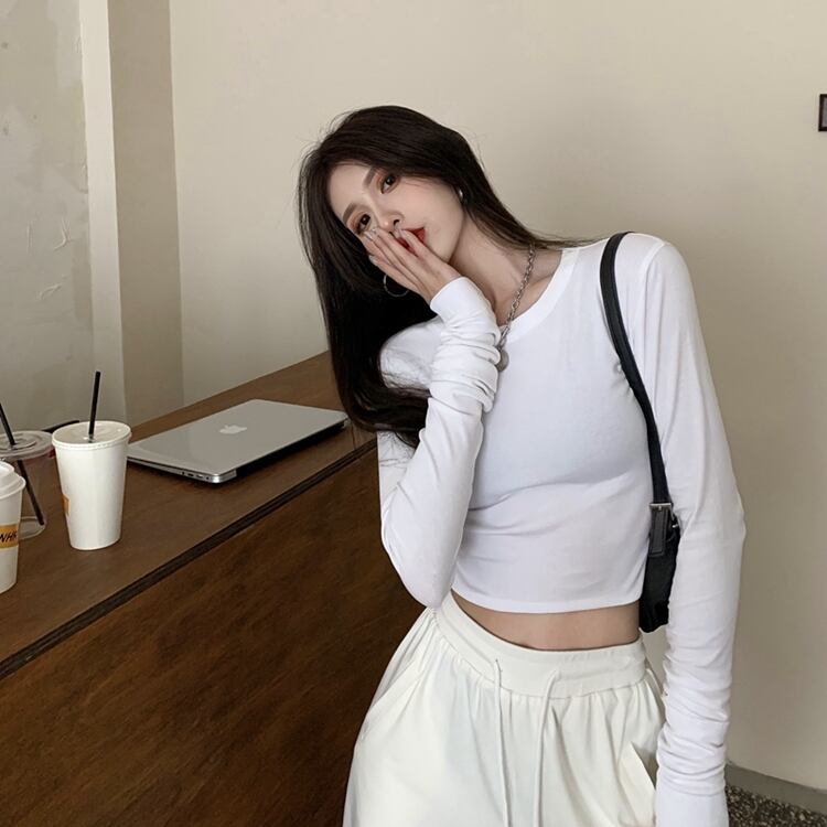 スプリング秋物Tシャツシャツ ショートハイウェストホワイトゆったりボタンスタイル ロング 春物 オータム 長袖 ウエスト Marchs96840435733