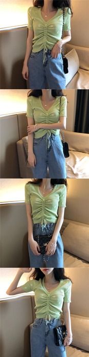 Tシャツ夏服Vネックギャザースタイルニットトップス トレンド 夏物 Marchs41019314570
