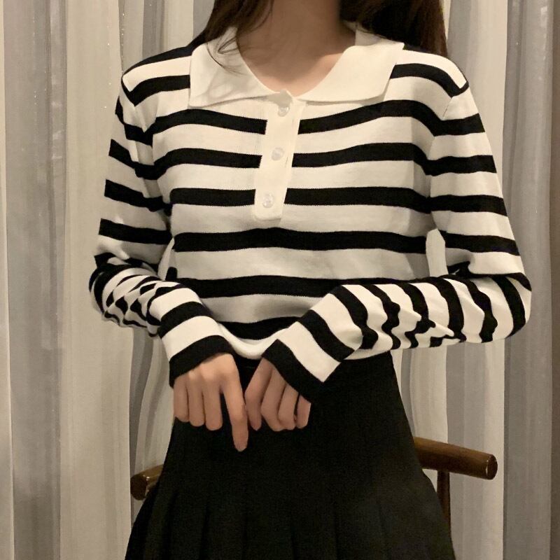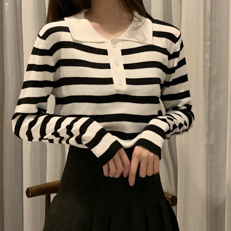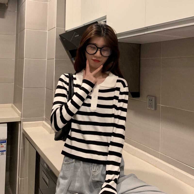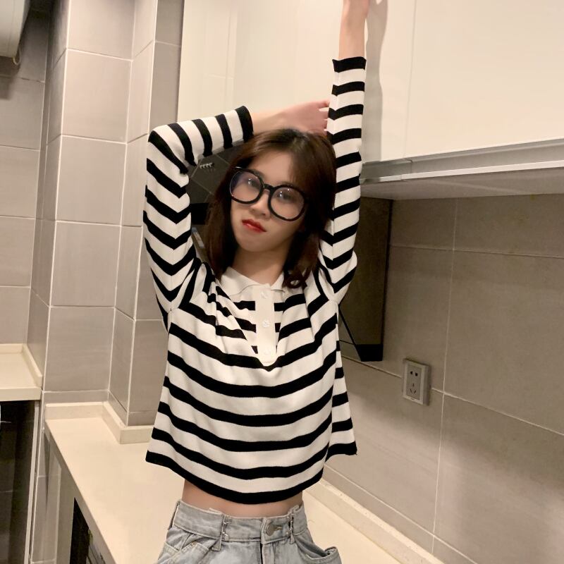 スプリングレディースカラーブラックホワイトストライプTシャツルーズ薄手ニットセーター 韓国ファッションブラウス ロング 春物 スタイル 長袖 Marchs74676708263