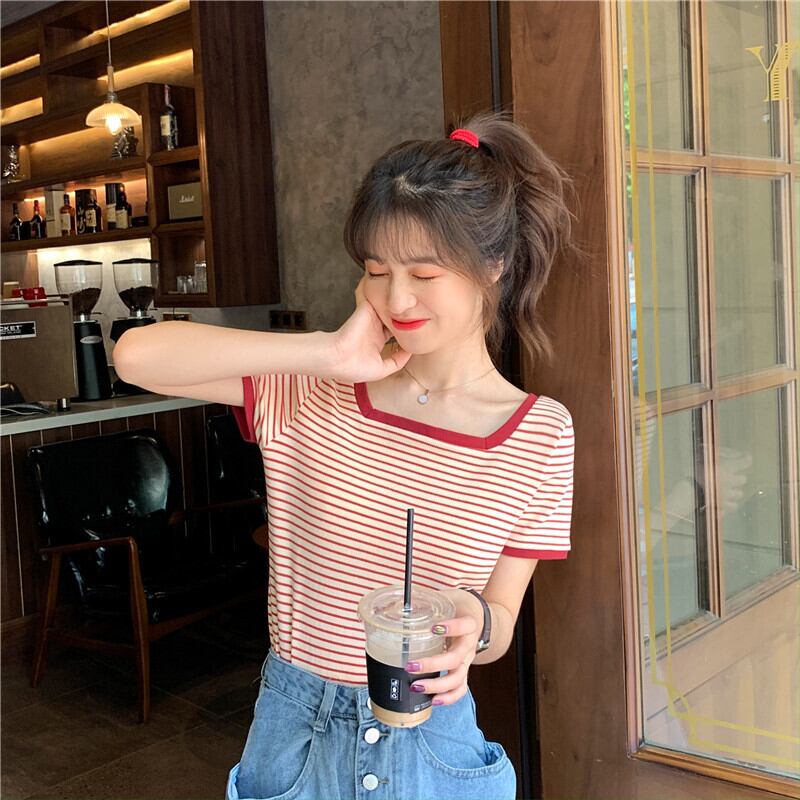 夏服スタイルショートストライプTシャツシャツ カラースリムゆったり コットン 夏物 ピュア スクウェア Marchs56342451936