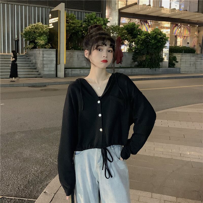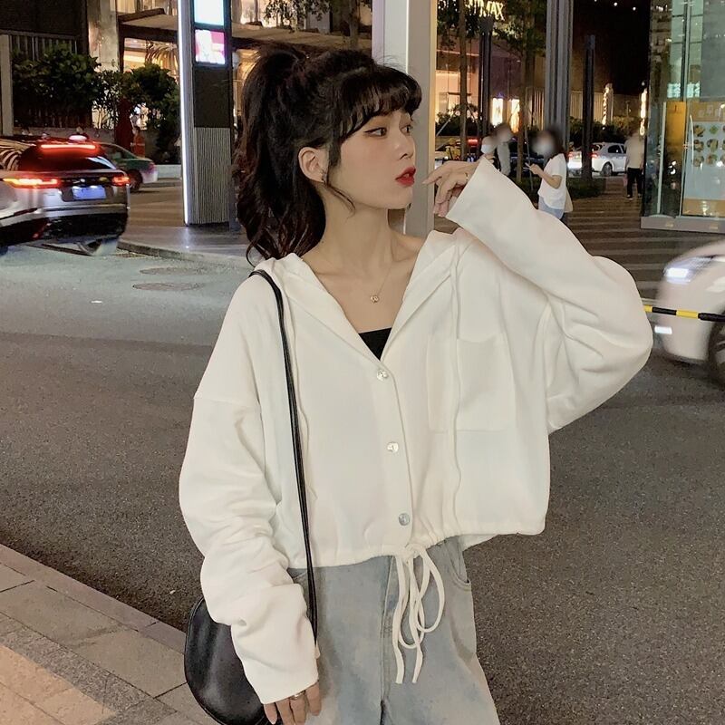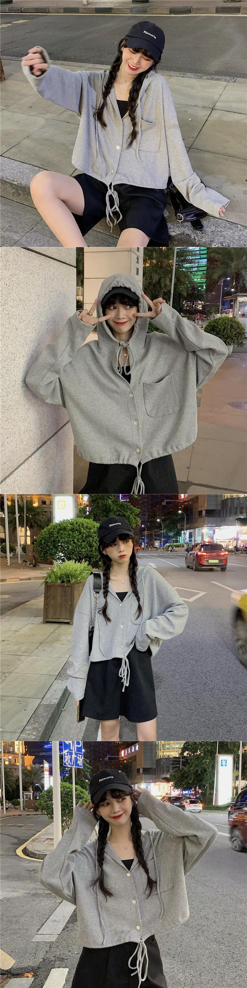 ギャザーフードカーディガンセーター スプリング秋物薄手ルーズ韓国ファッションスタイルクロップドトップス レース 春物 オータム レースアップ Marchs55449766060