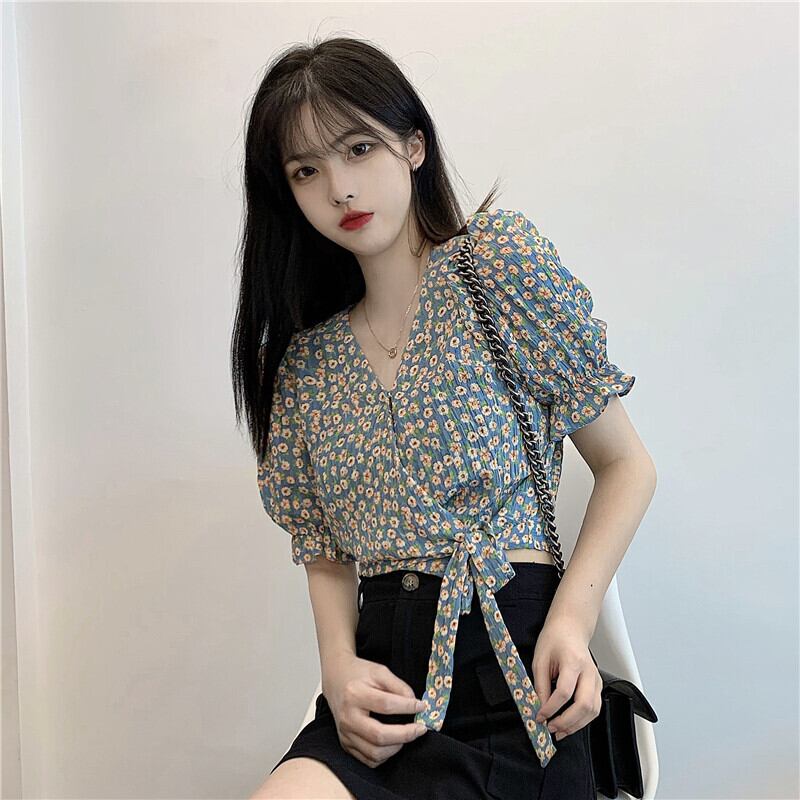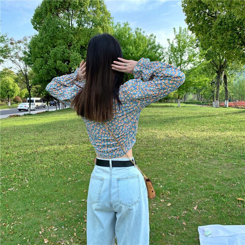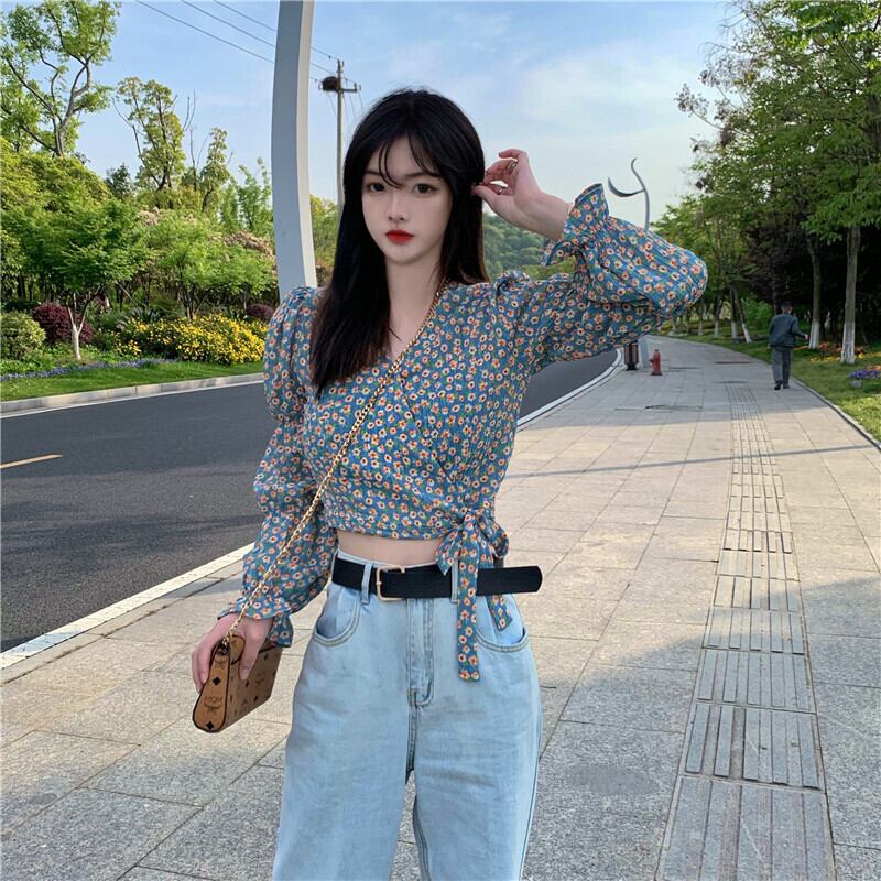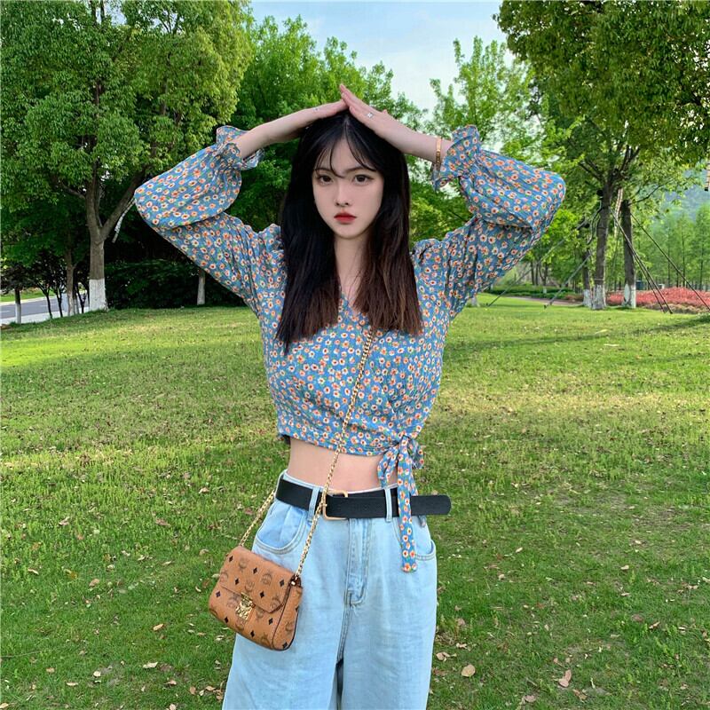 フローラルスリーブシフォンシャツ スプリング夏服スリム薄手ショートVネックトップス ロング 春物 夏物 花柄 長袖 Marchs97489683123