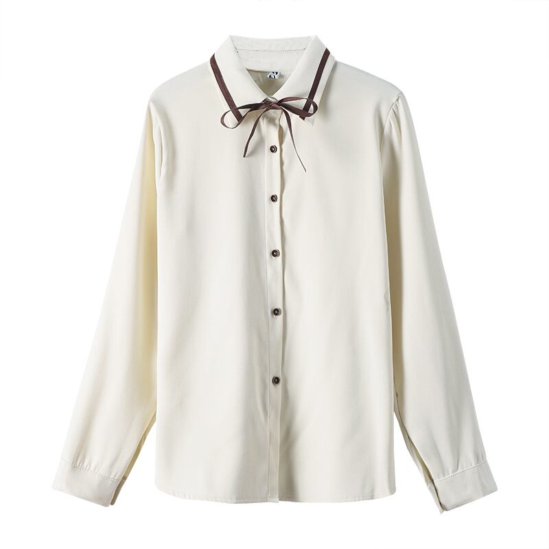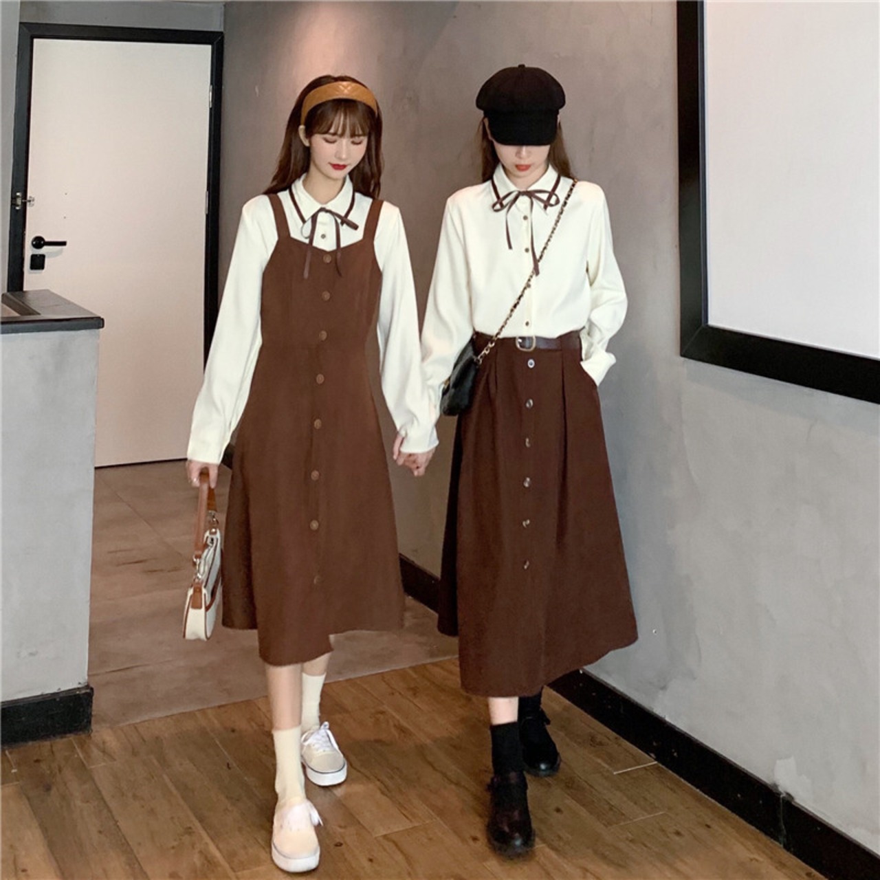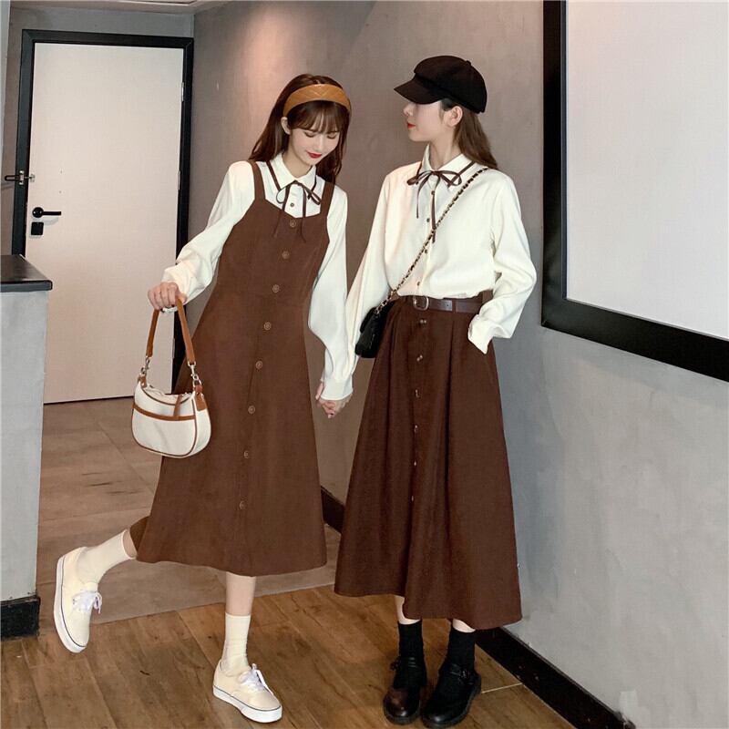 色:オフホワイトのシャツ,茶色のスカート,ストラップドレス