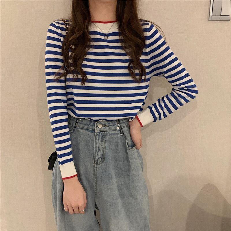 スプリング韓国ファッションストライプカラールーズセーター ラウンドネックシャツ レディース ロング 春物 Oネック シルク スタイル 長袖 Marchs7458984993