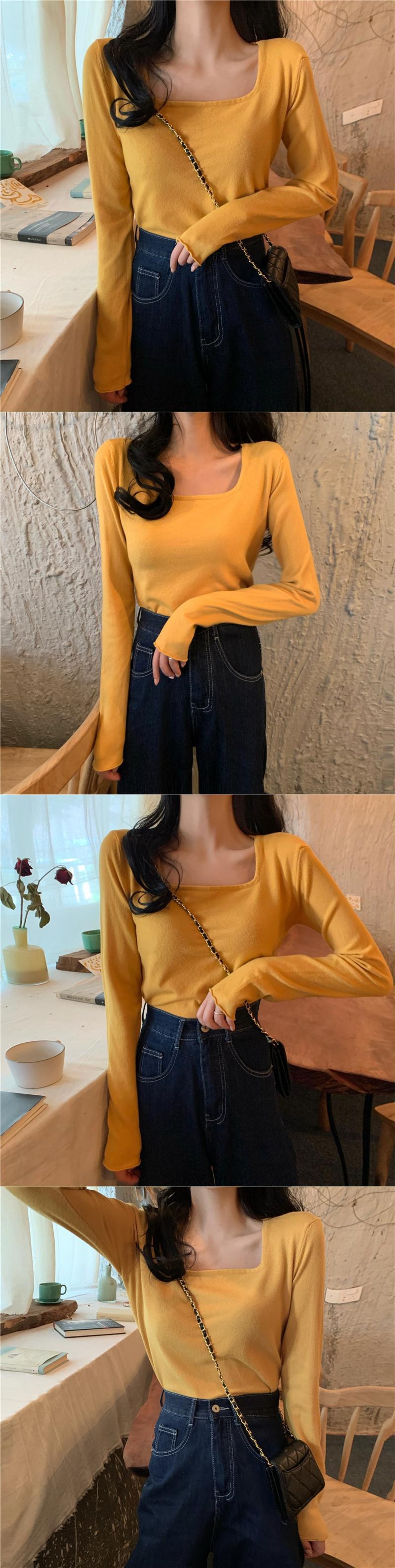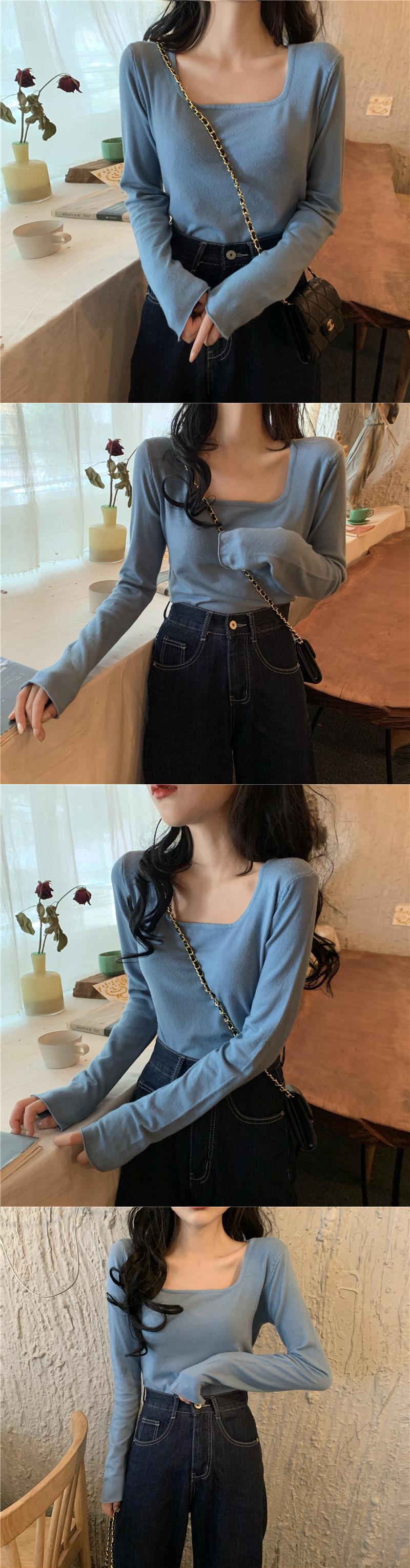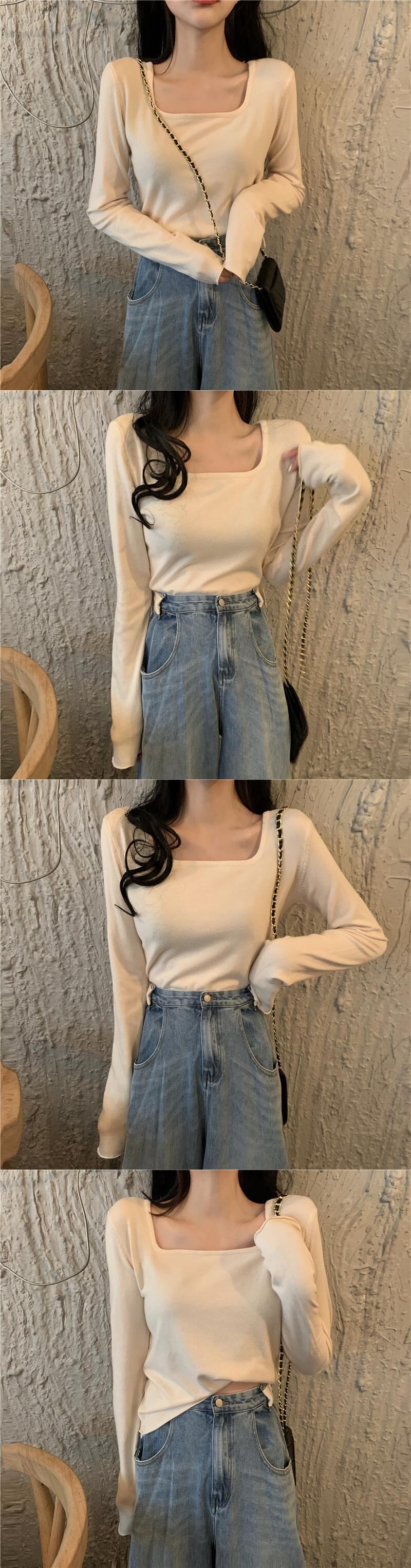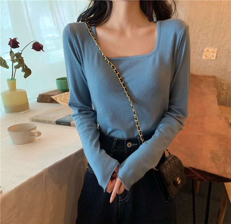 スタイルスリムソリッド カラーニットTシャツシャツ ゆったり夏服薄手トップス ロング 夏物 ソリッドカラー スクウェア 長袖 Marchs76690057612