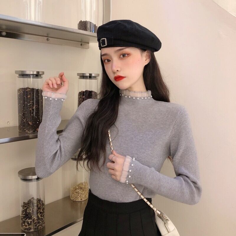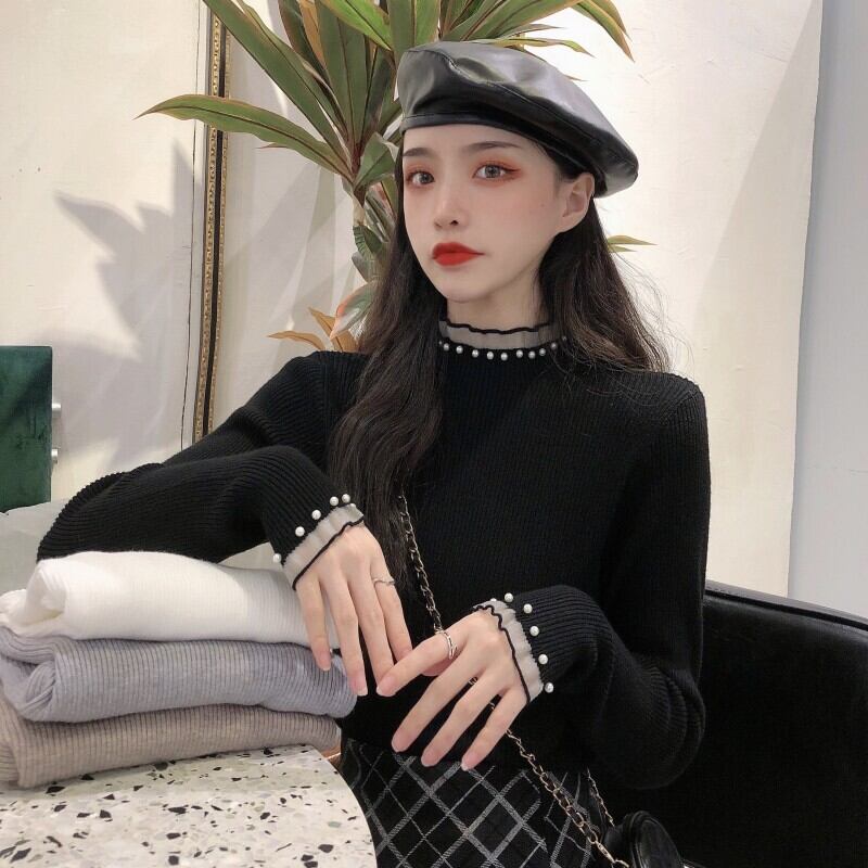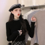 スタイルカラーニットセーター ブラックプルオーバー レースゆったりシャツ スプリング 春物 Marchs47939337265