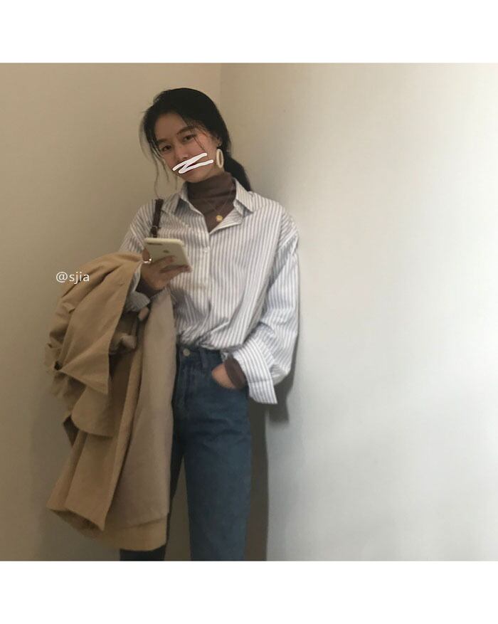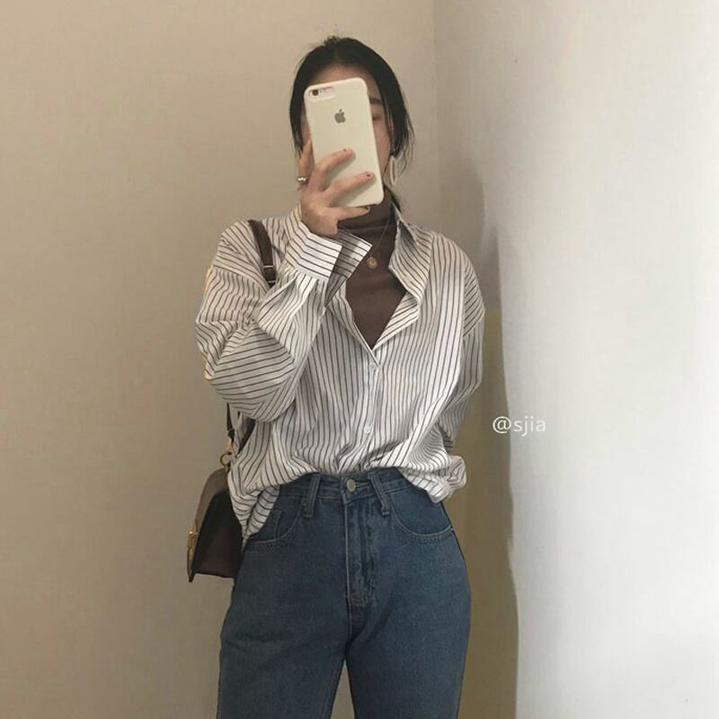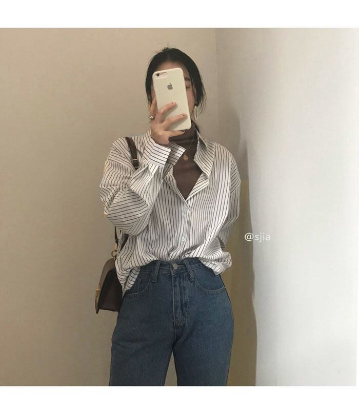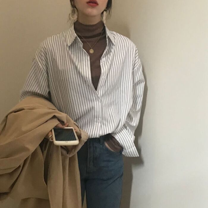 ホワイトストライプシャツ レディーススプリングスタンダードブラウス ロング レトロ 春物 長袖 Marchs64257069765