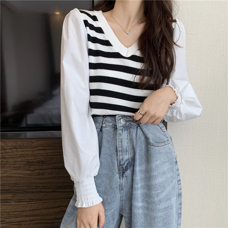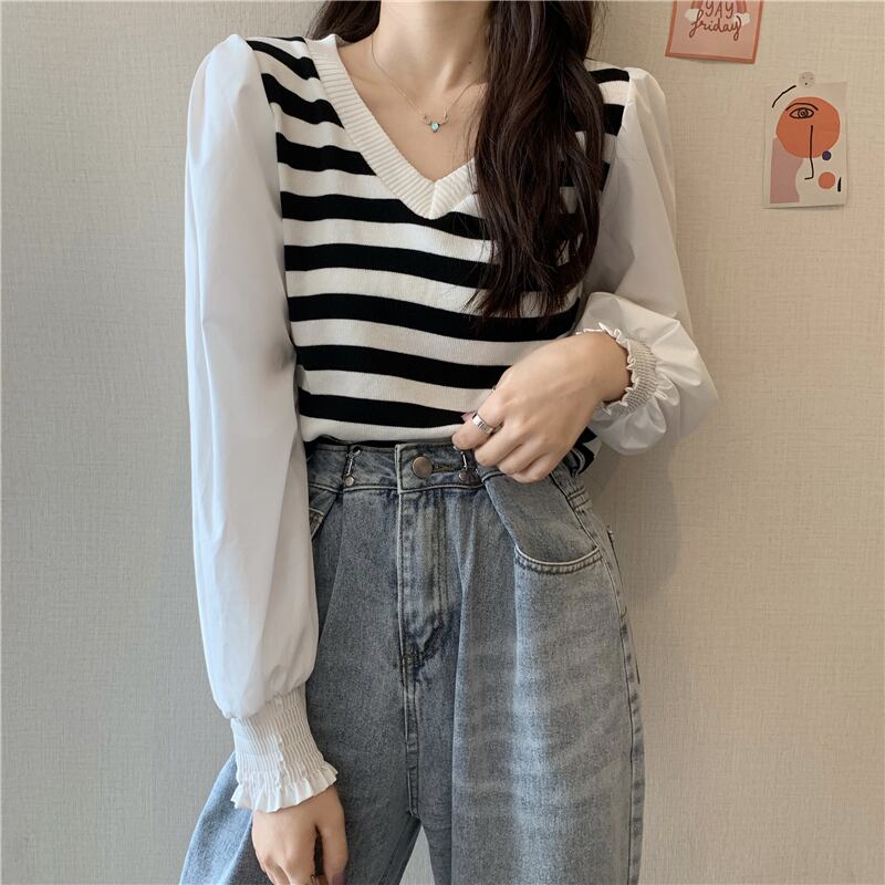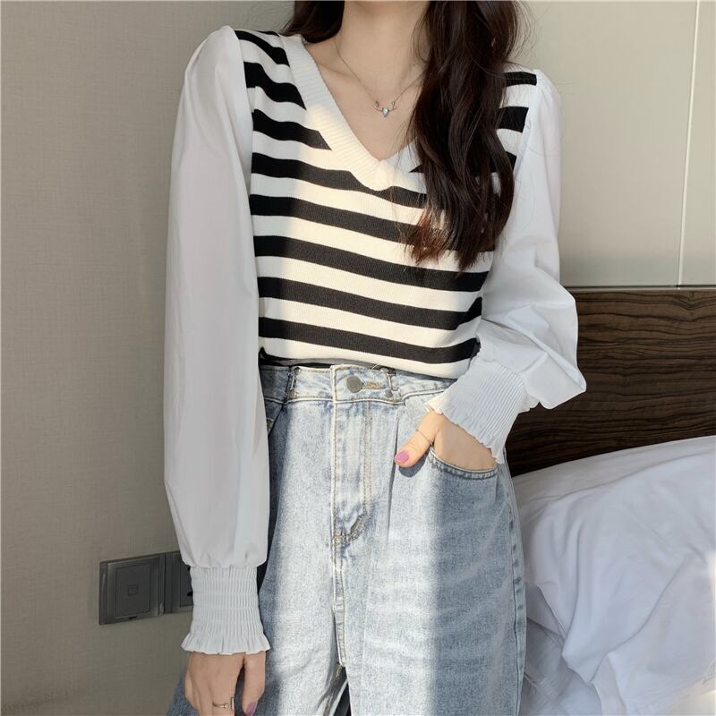 ストライプシャツ レディーススプリングスタンダードVネックトップス レトロ 春物 Marchs86270248530