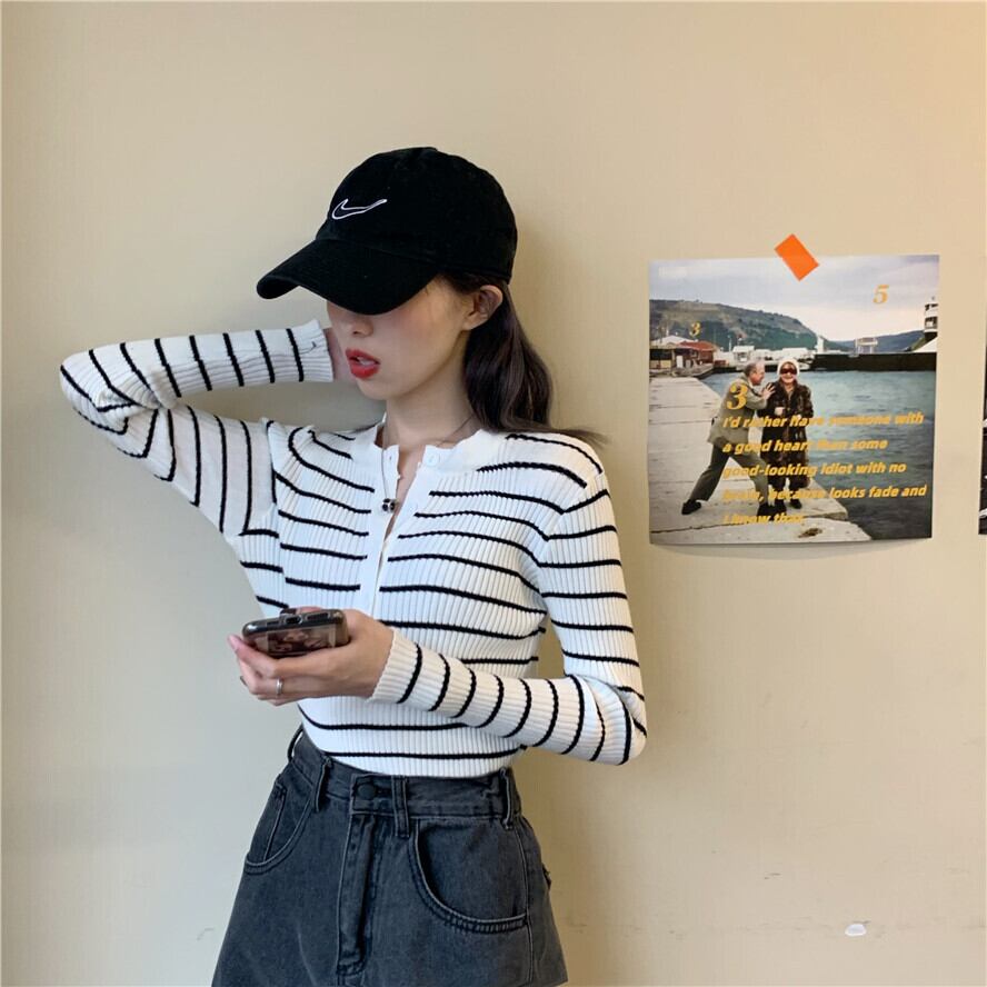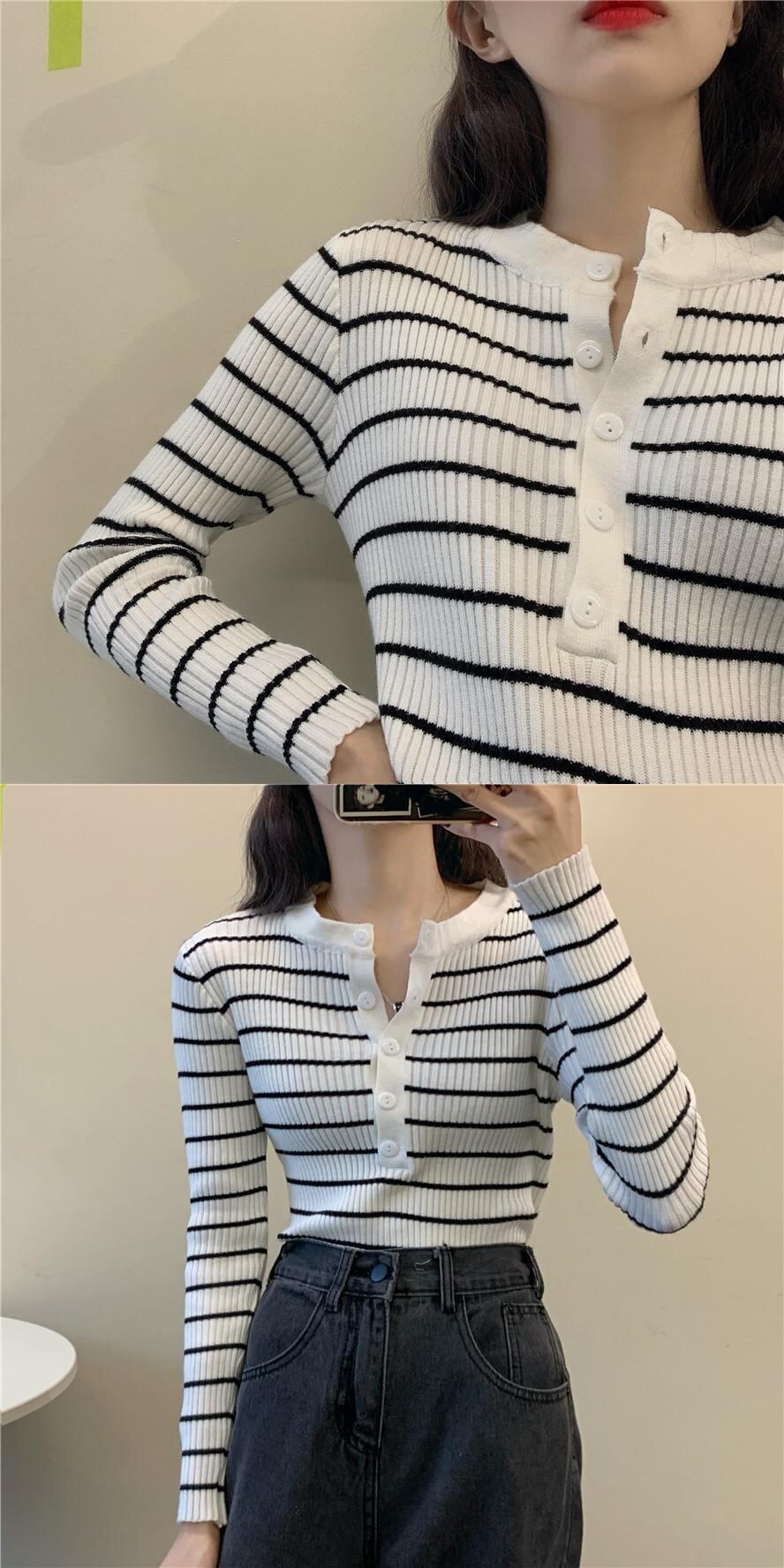 スプリングスタイルストライプVネックニットゆったりシャツ レディース薄手スリムトップス ロング 春物 長袖 Marchs96421815230