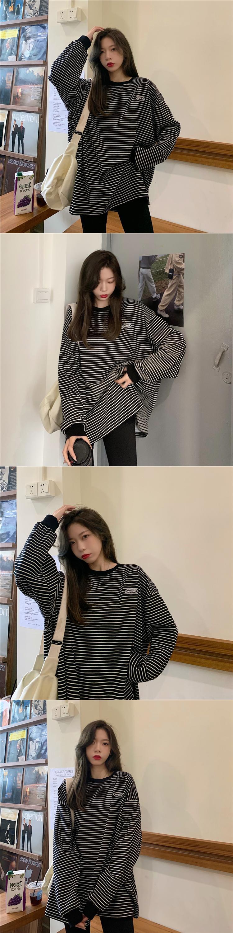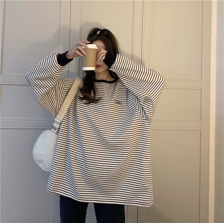 ストライプTシャツスプリング韓国ファッションスタイルルーズカジュアルトップス ロング 春物 長袖 ミドル丈 Marchs72578978782