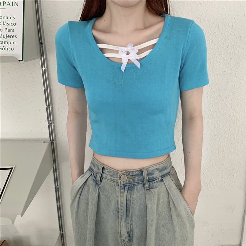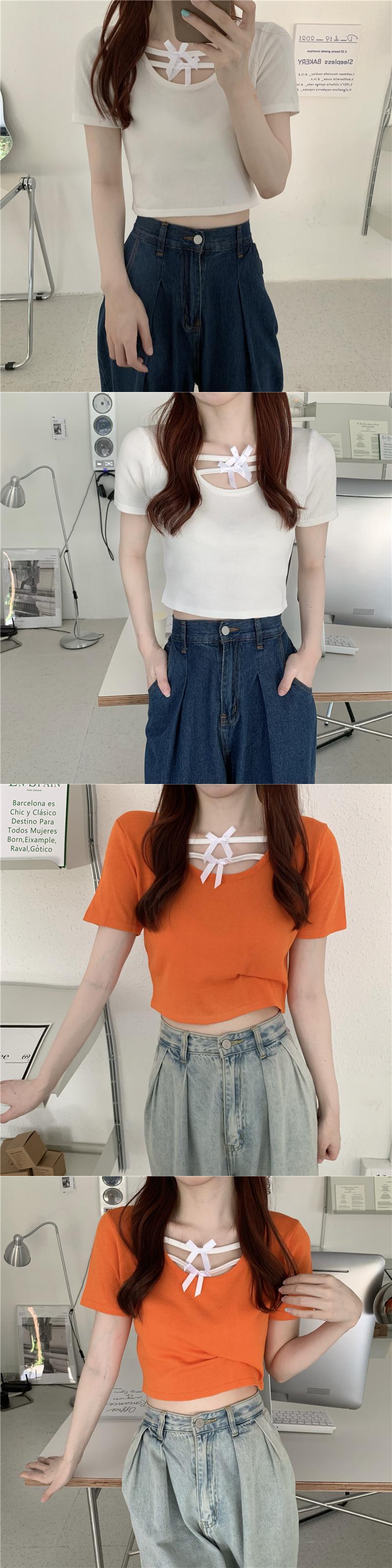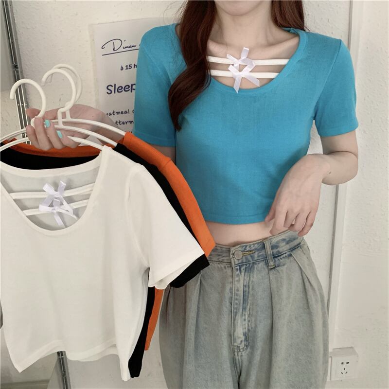 ブラウス ショート夏服リボンスリムTシャツレディース半袖スリーブトレンド ハーフスリーブ 大人ガーリー スウィート キュート カジュアル 夏物 Marchs98999567897
