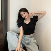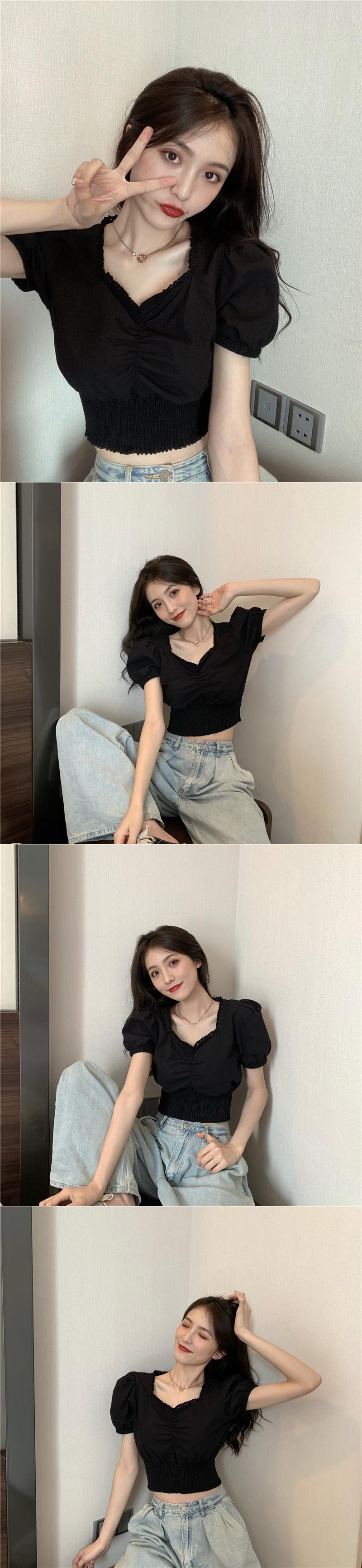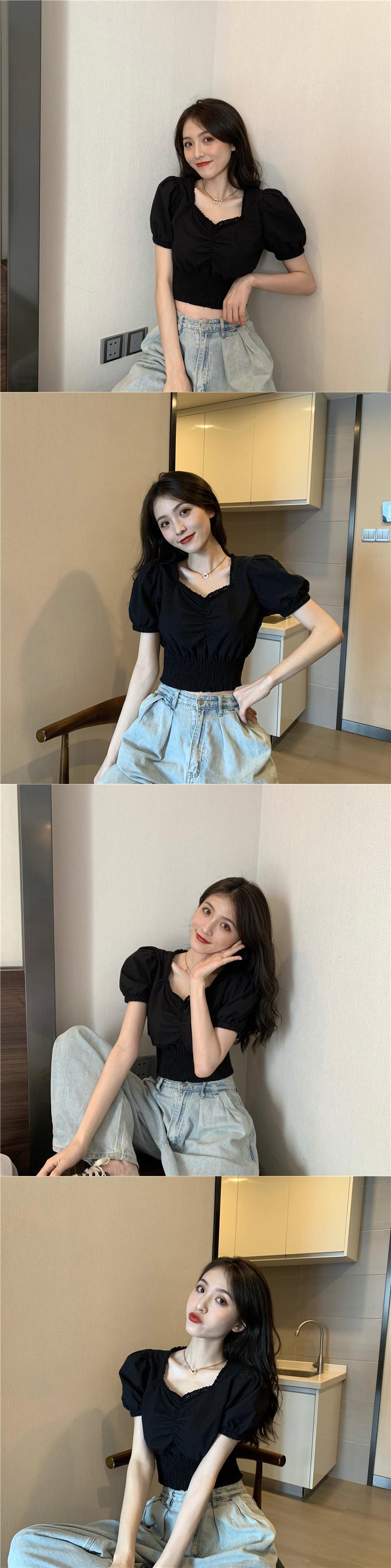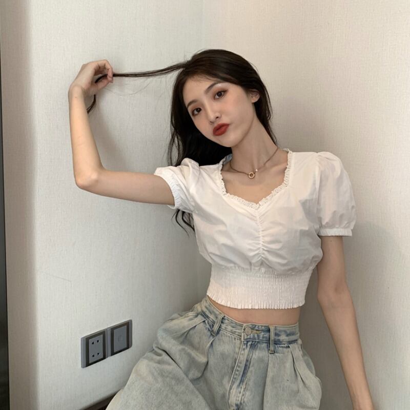 スタンダードスリーブトップス ハイウェストウェストショートTシャツシャツ レディース夏服 レトロ 夏物 スクウェア ウエスト Marchs96831048069