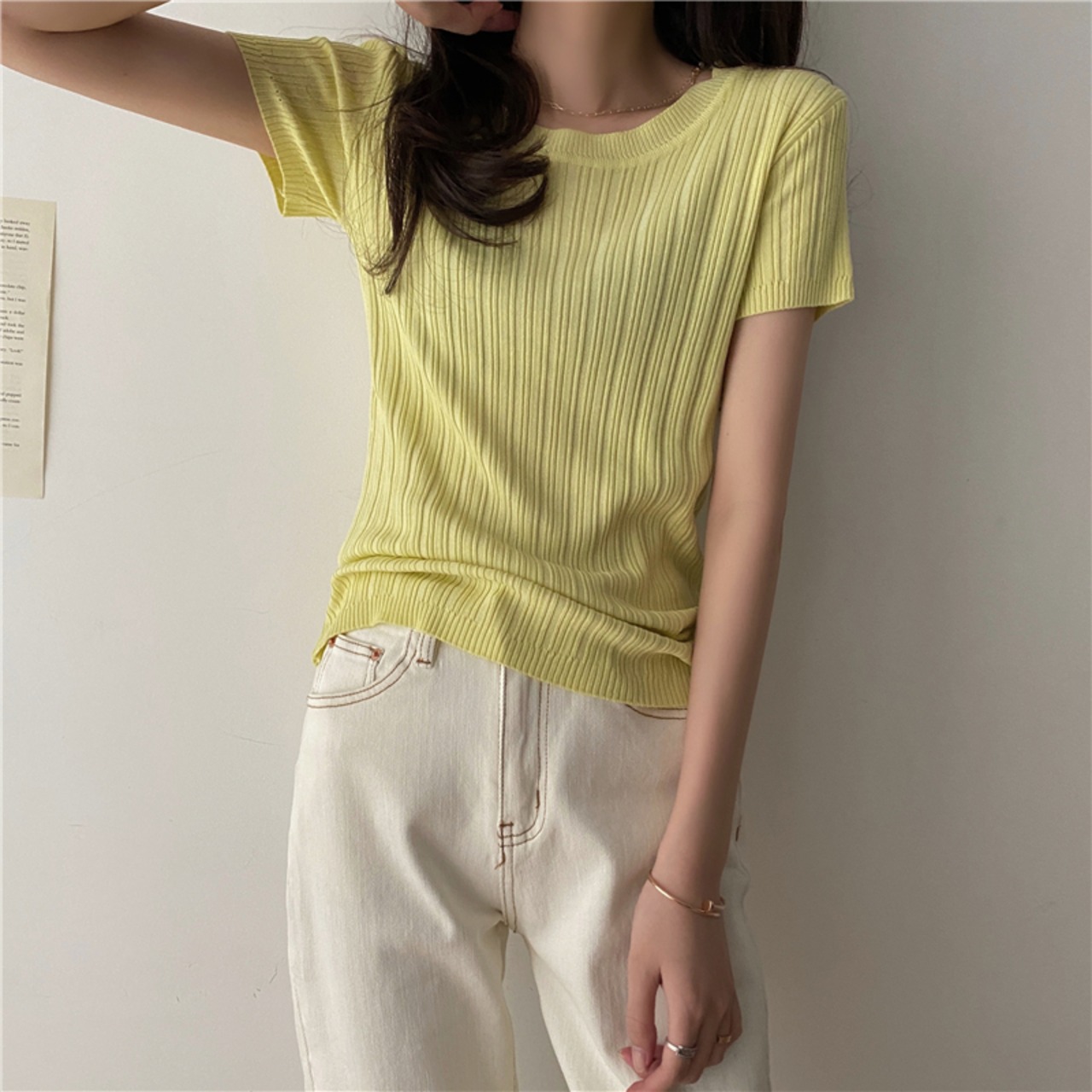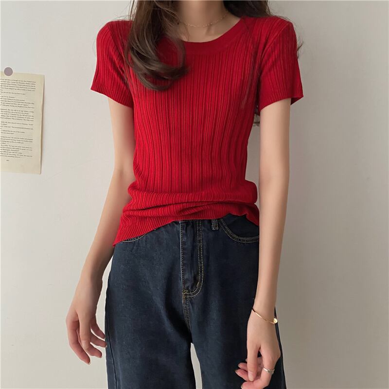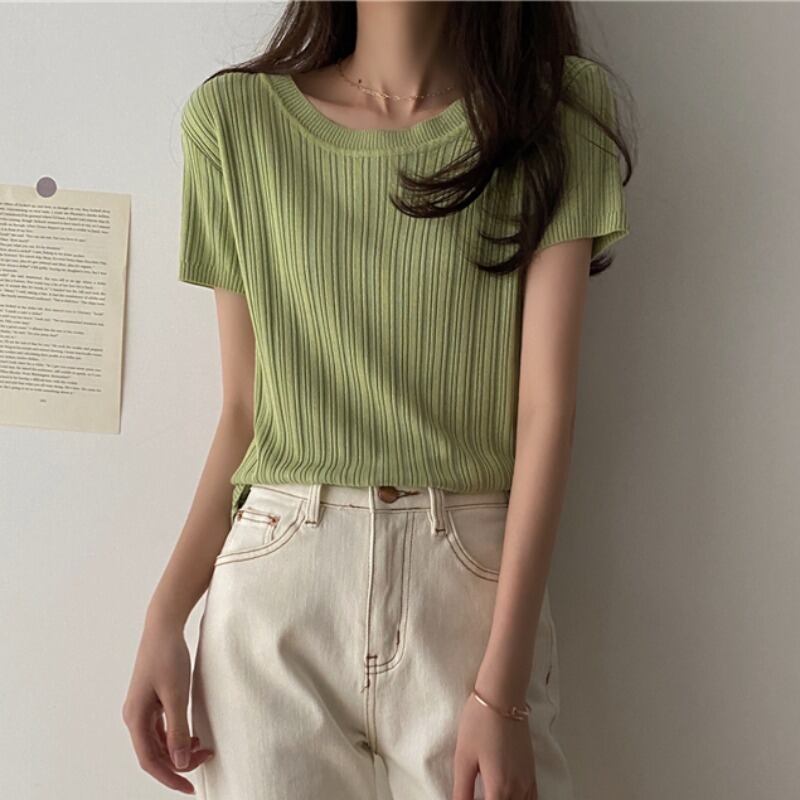 韓国ファッショントレンドラウンドネックグリーンニットレディース夏服薄手スリムゆったりトップス Tシャツ 夏物 Oネック シルク スタイル Marchs84136580782