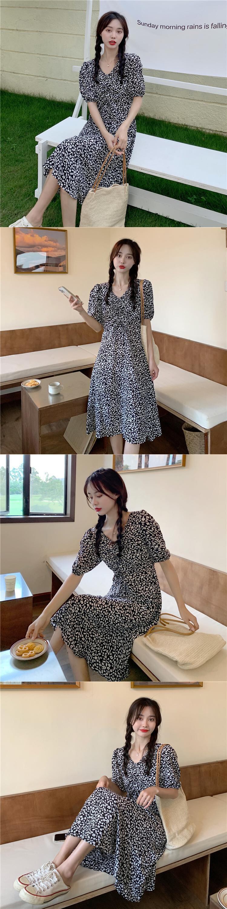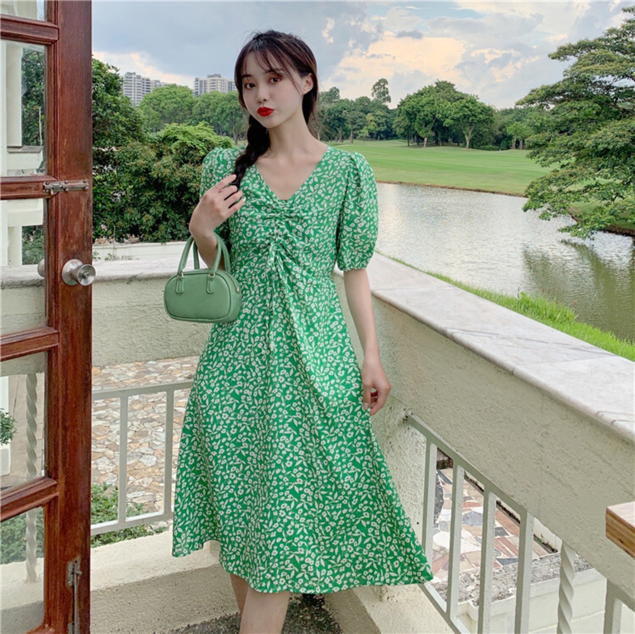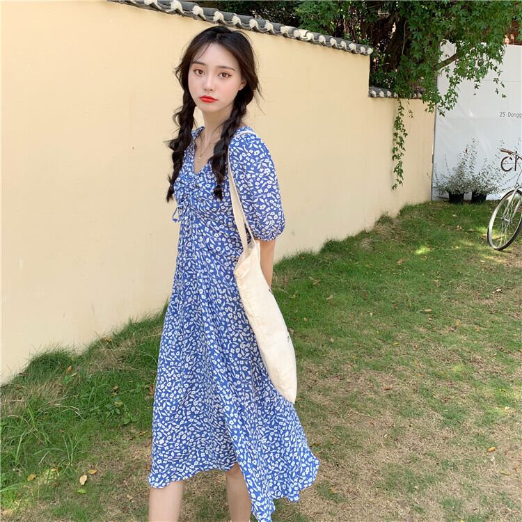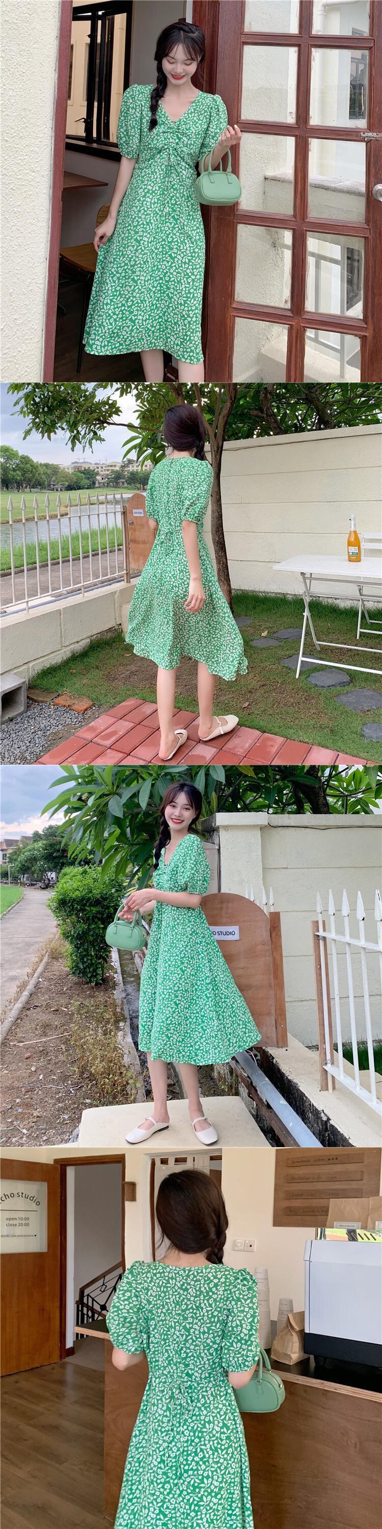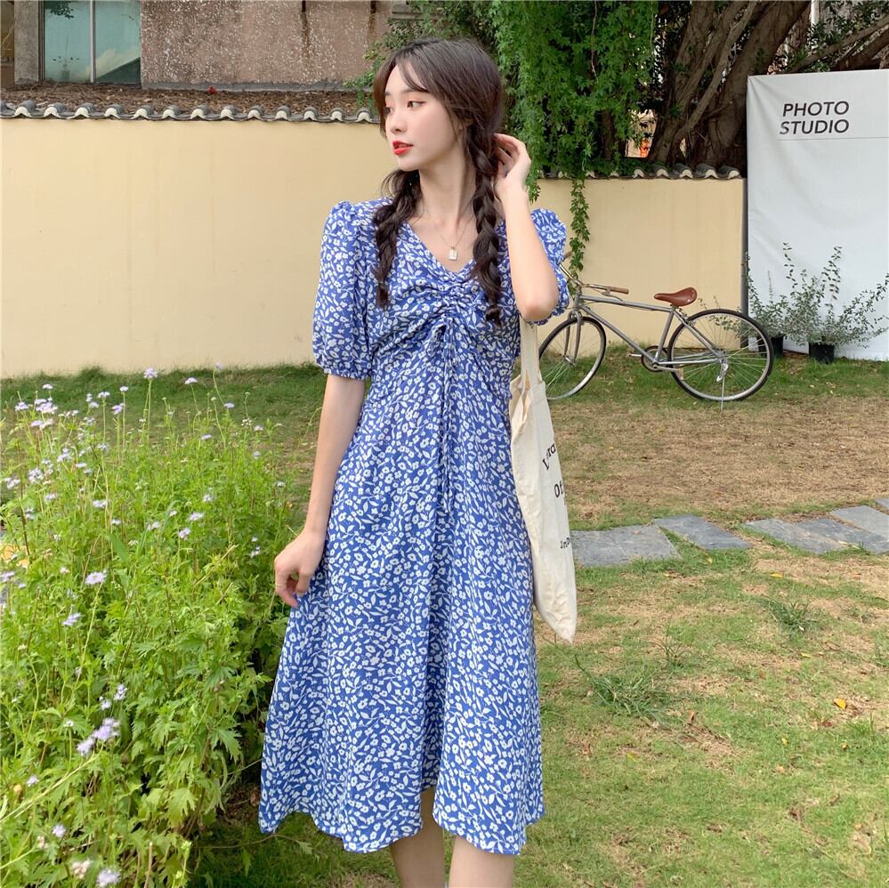 フローラルワンピース夏服ウェスト薄手Vネックスカート 夏物 花柄 ウエスト Marchs83781753241