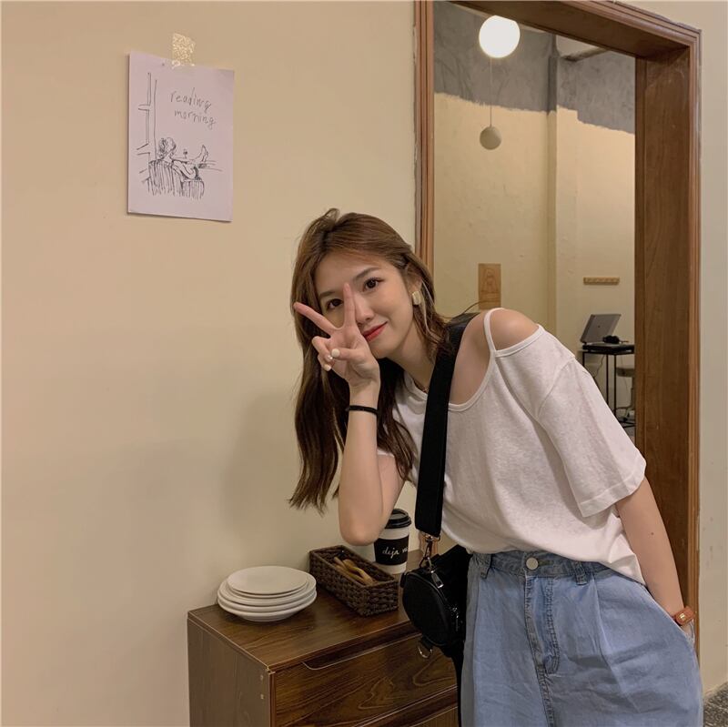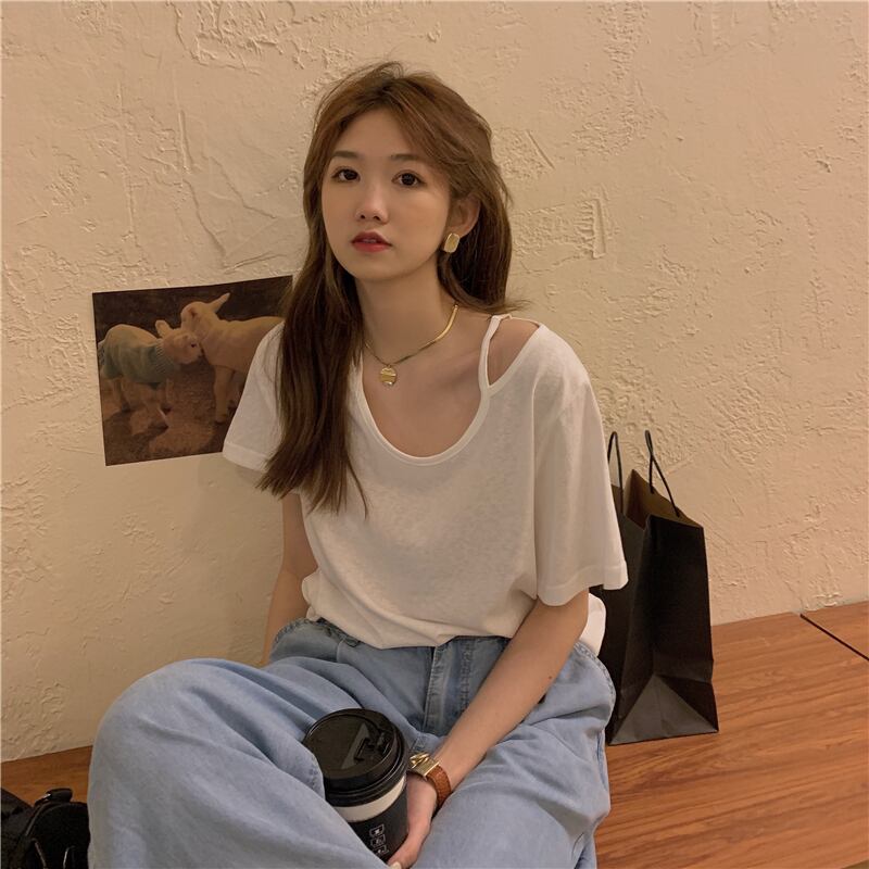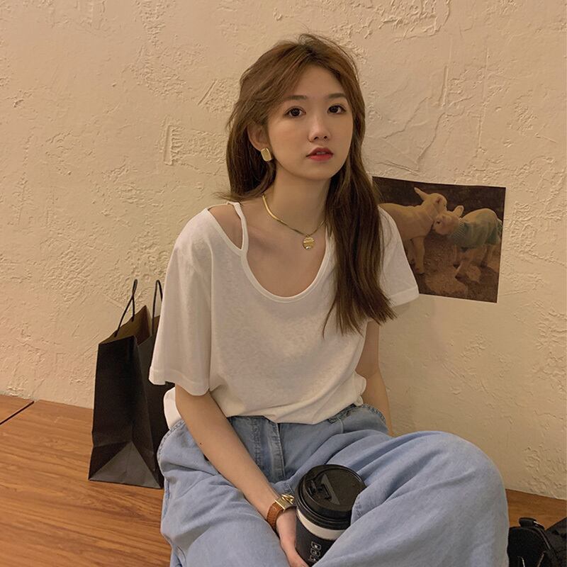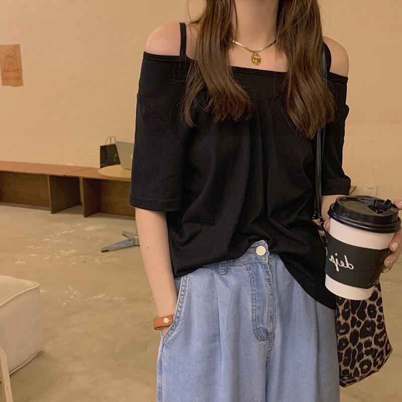 ブラックTシャツレディース夏服ルーズストラップレストレンド コットン 夏物 Marchs95572609881