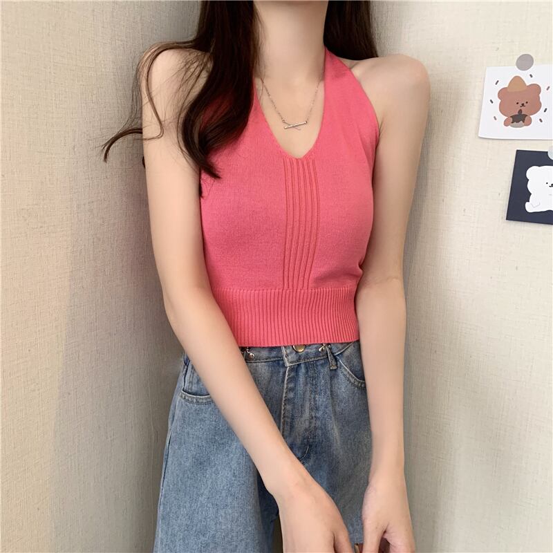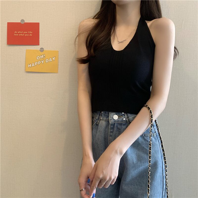 ブラックレディース夏服ストライプニットホルタートップス 夏物 Marchs1278854250