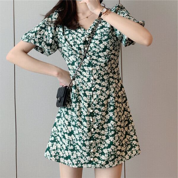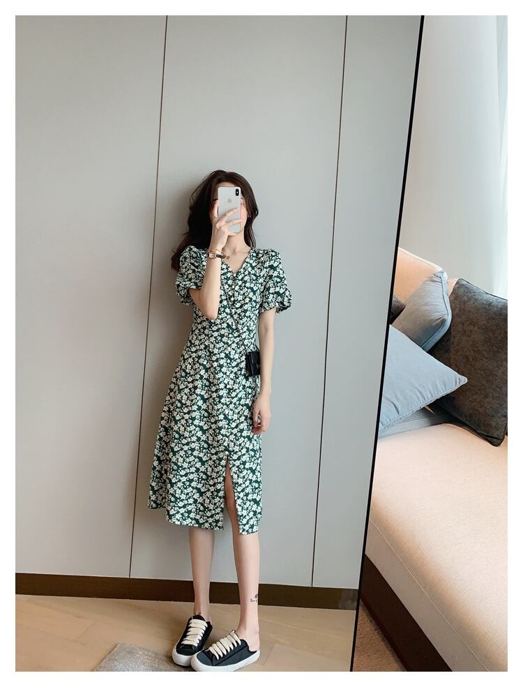 夏服Vネックフローラルスリーブワンピース レトロ 夏物 花柄 スカート ウエスト Marchs96776286966