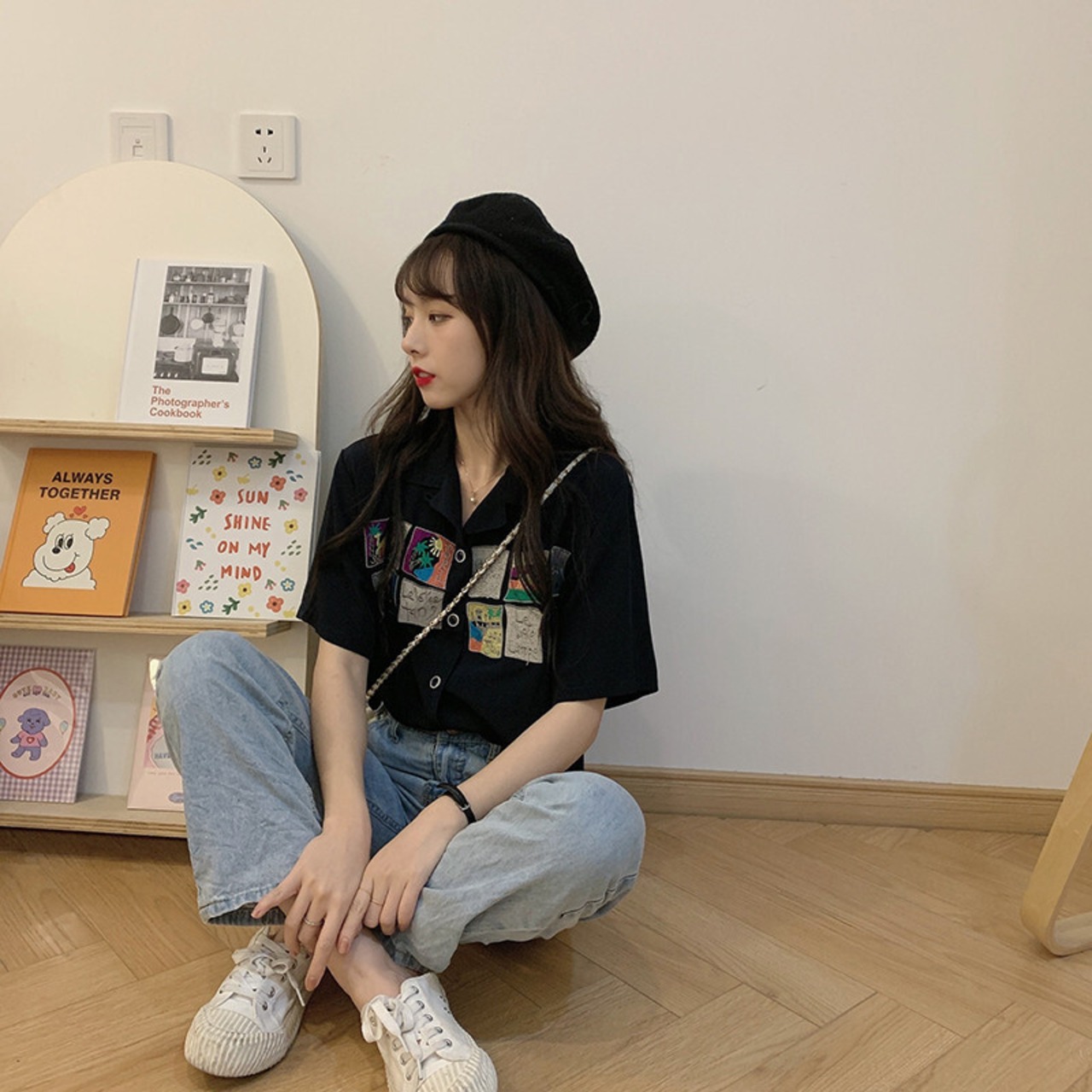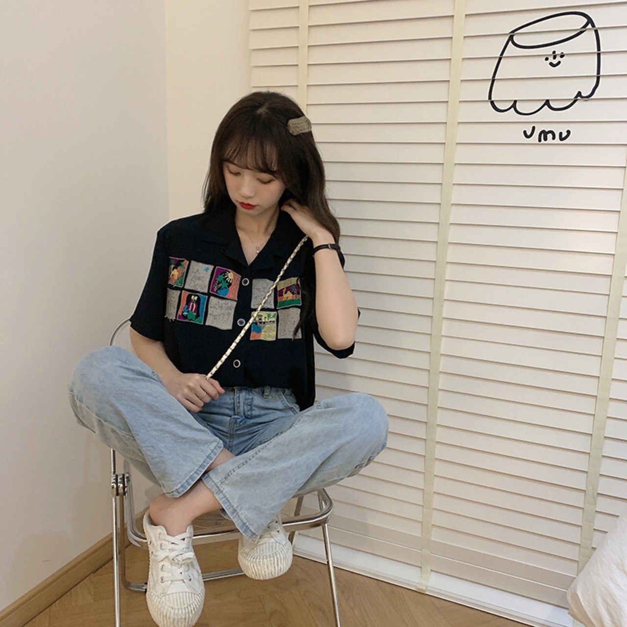 スタンダードプリントシャツ 夏服ルーズブラックトップス レトロ 夏物 Marchs36688639079
