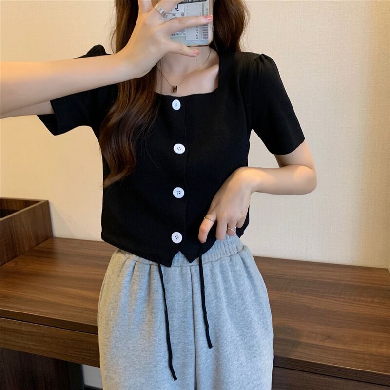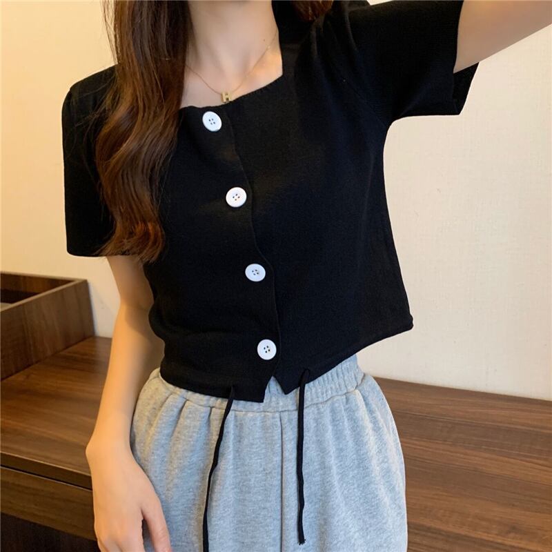 ギャザー薄手ニットショート夏服カラーTシャツトップス 夏物 スクウェア Marchs2324857079