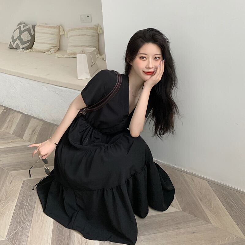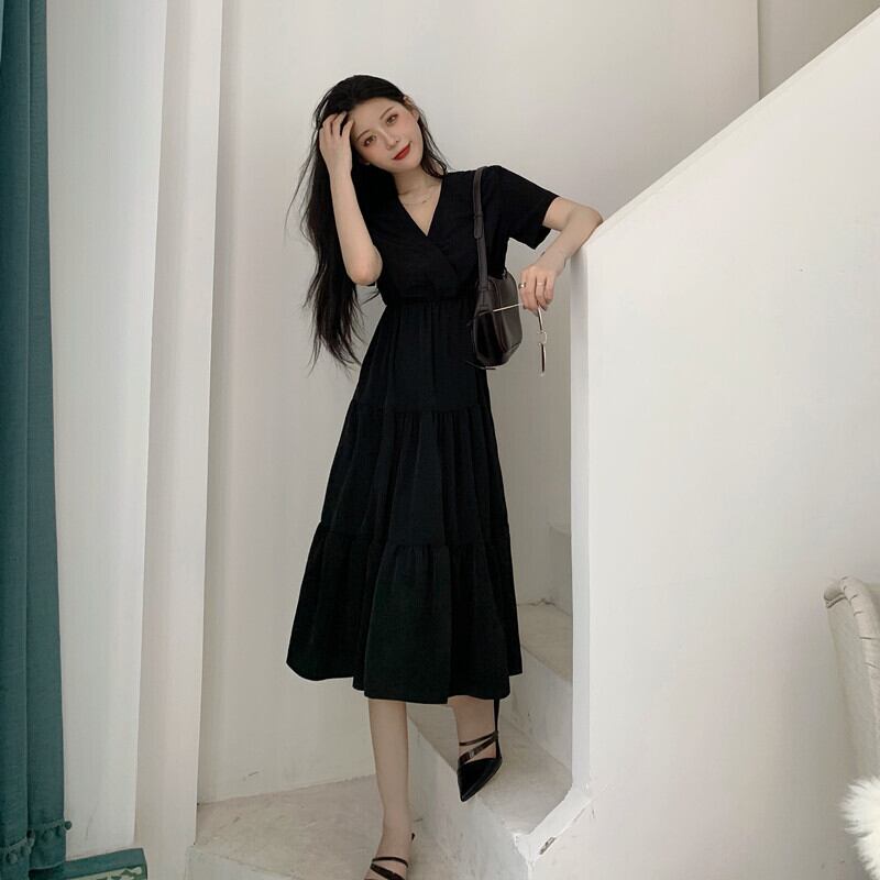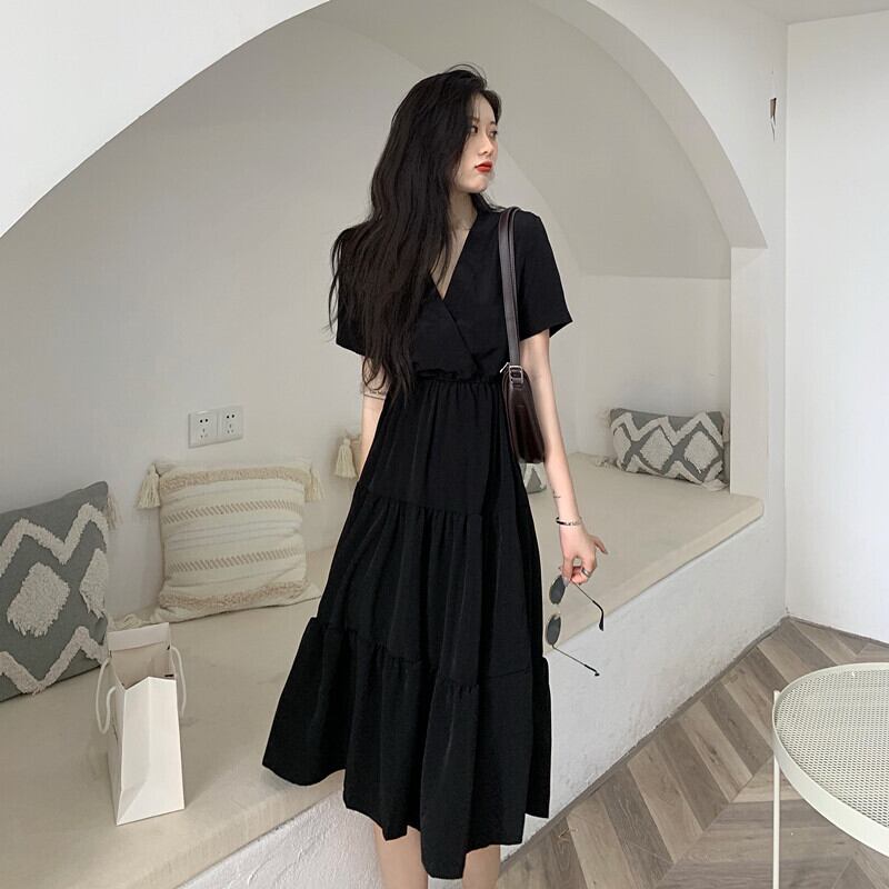 夏服スタイルブラックワンピースウェストロングスカート Vネックレディース 大人ガーリー スウィート キュート カジュアル 夏物 ウエスト Marchs97781928108
