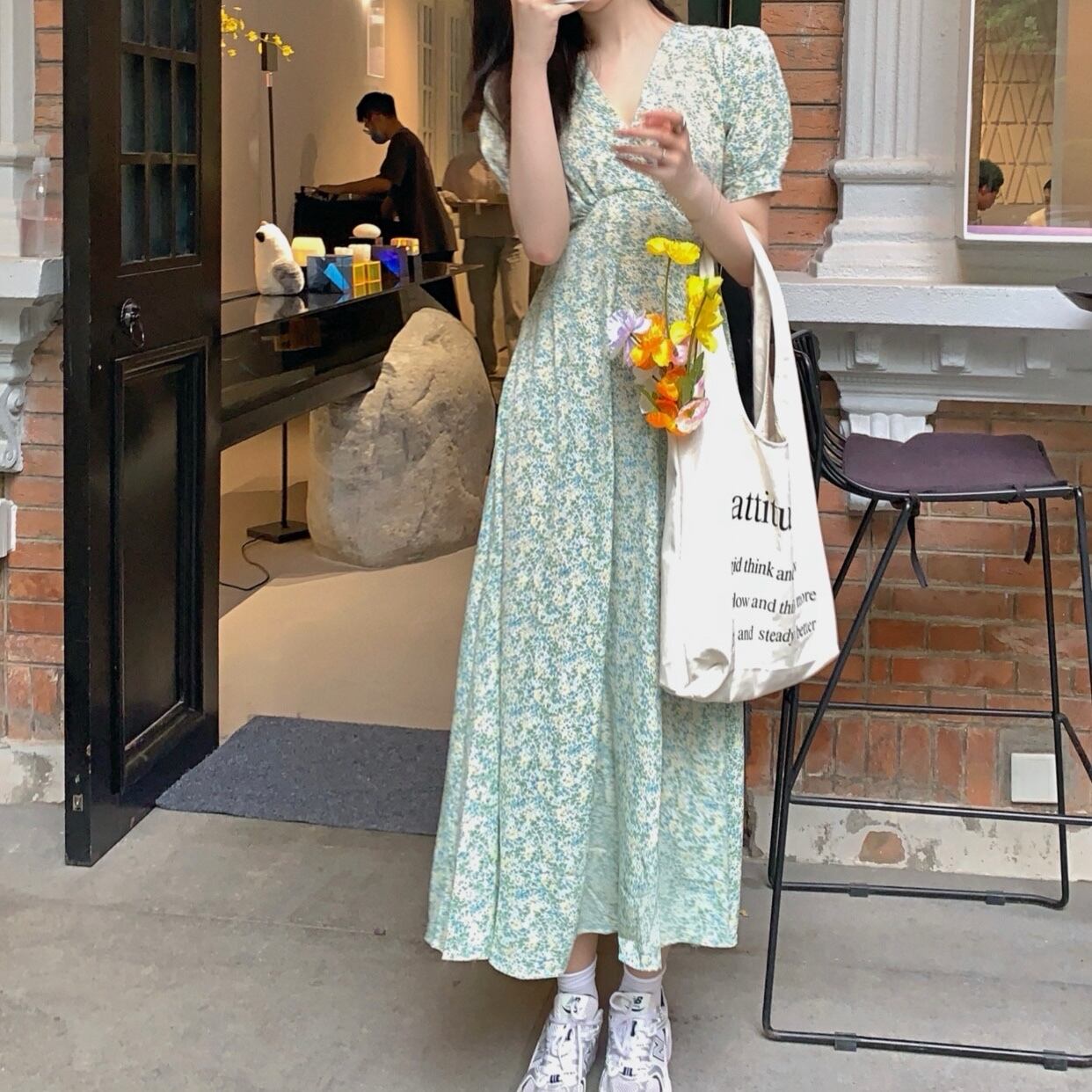 グリーンフローラルワンピース夏服ウェストVネックスリーブミディ 夏物 花柄 ウエスト Marchs30895819631
