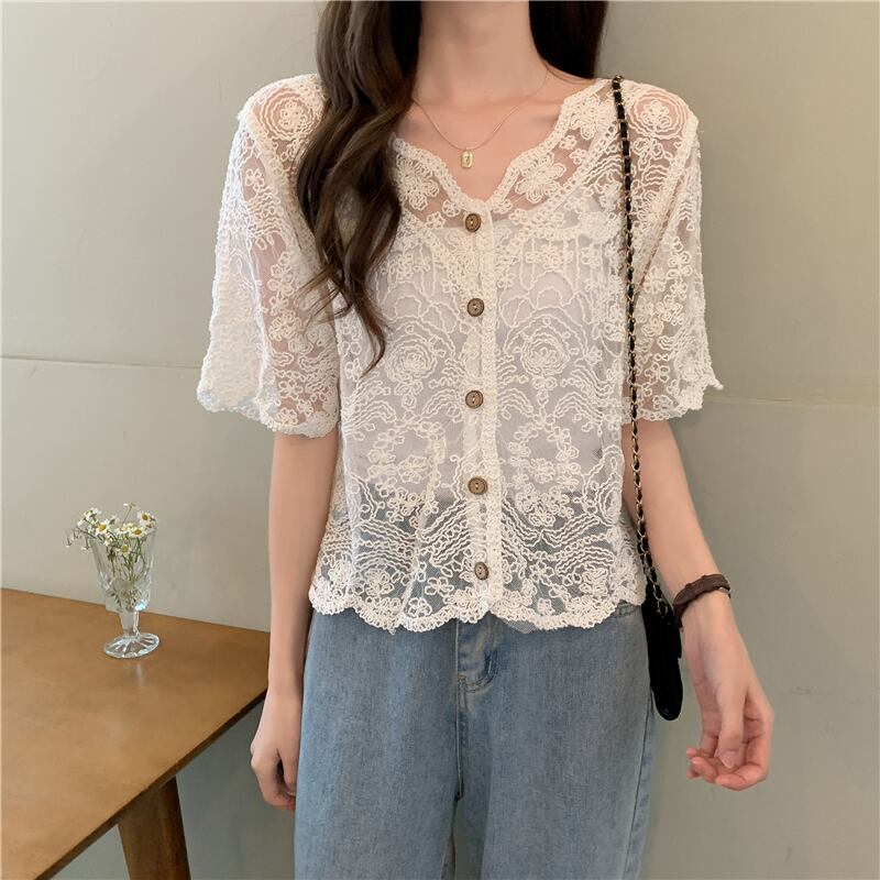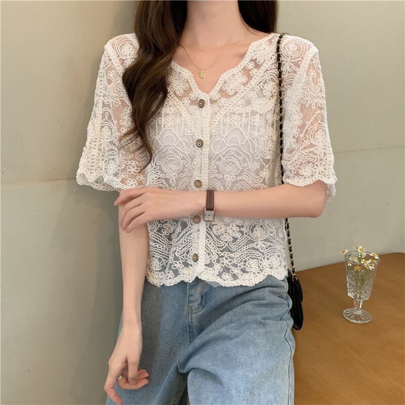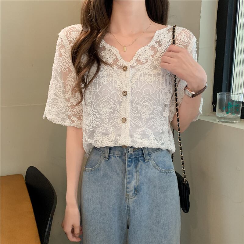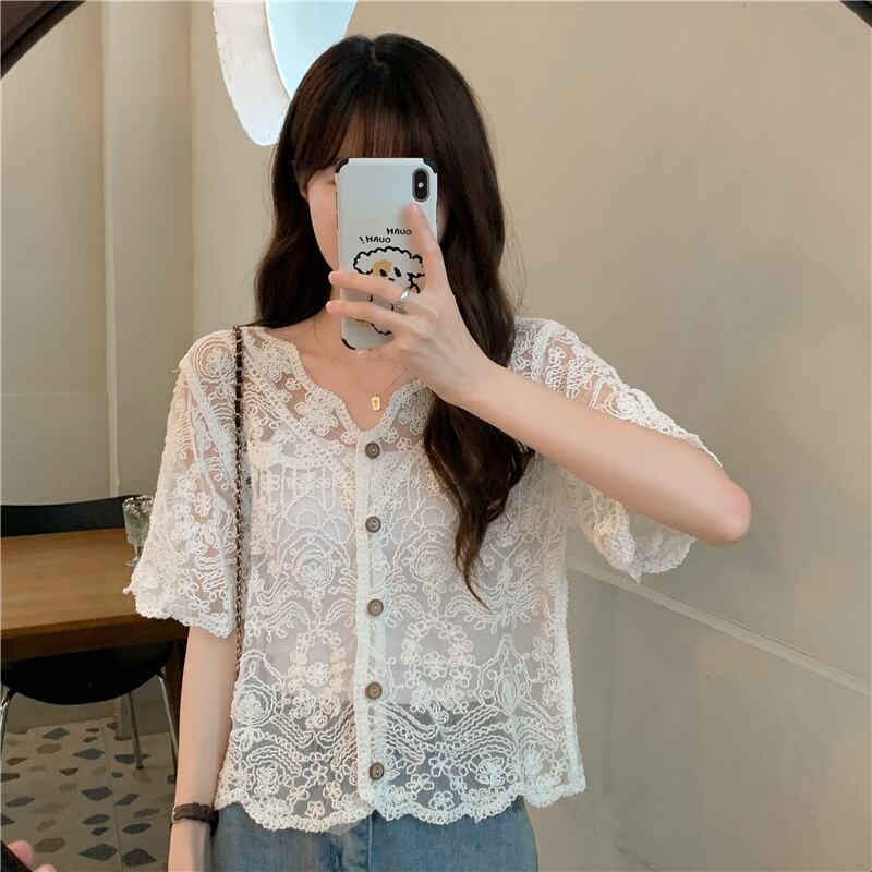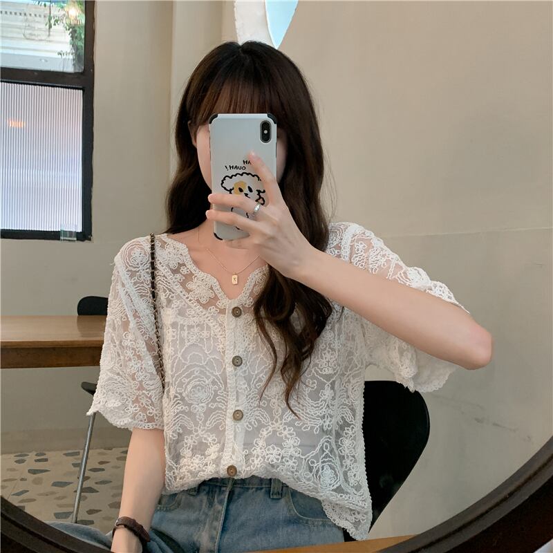 レースシャツ レディース夏服韓国ファッションスタイルルーズVネックカーディガントップス 夏物 Marchs98232578071