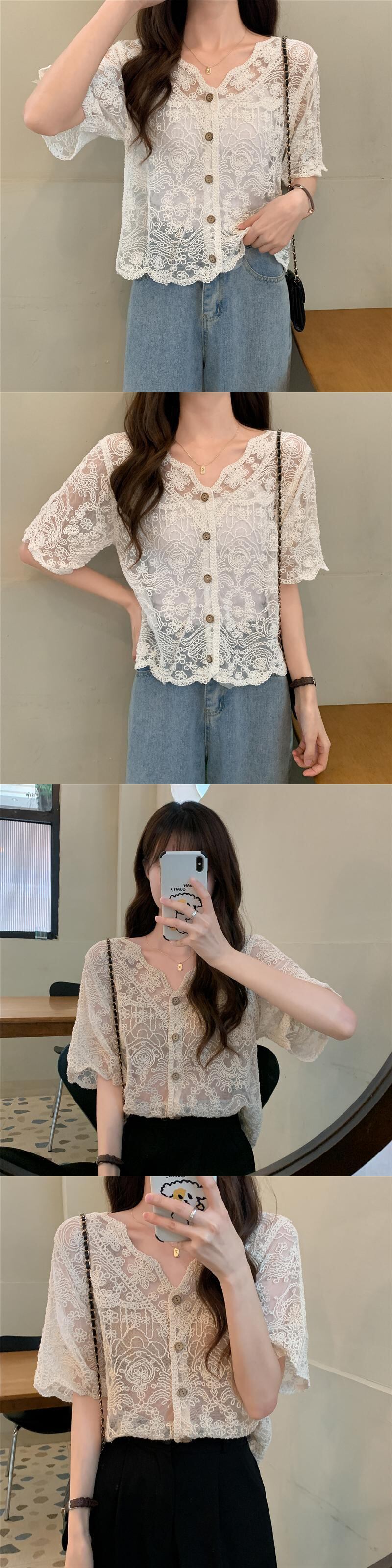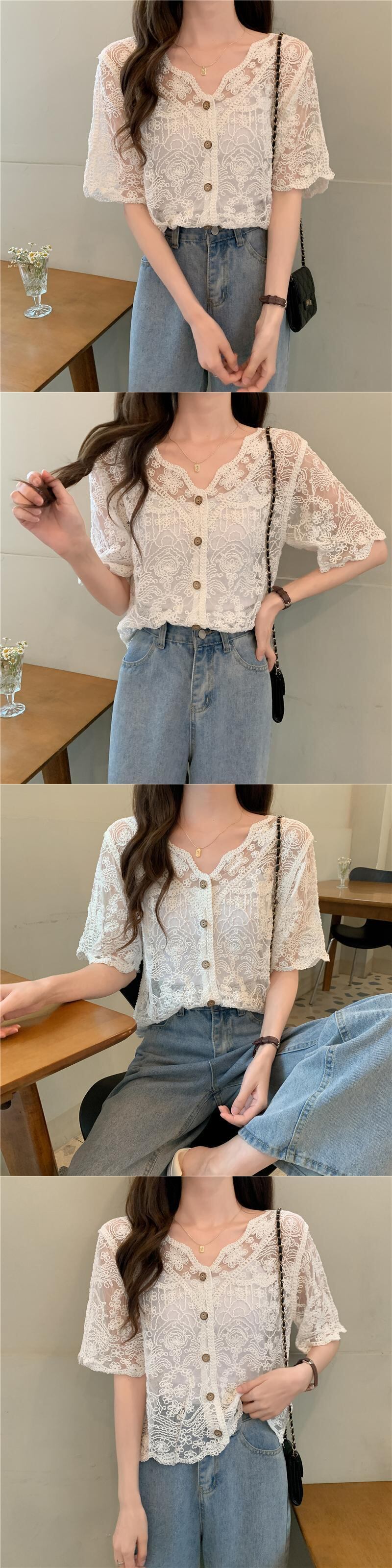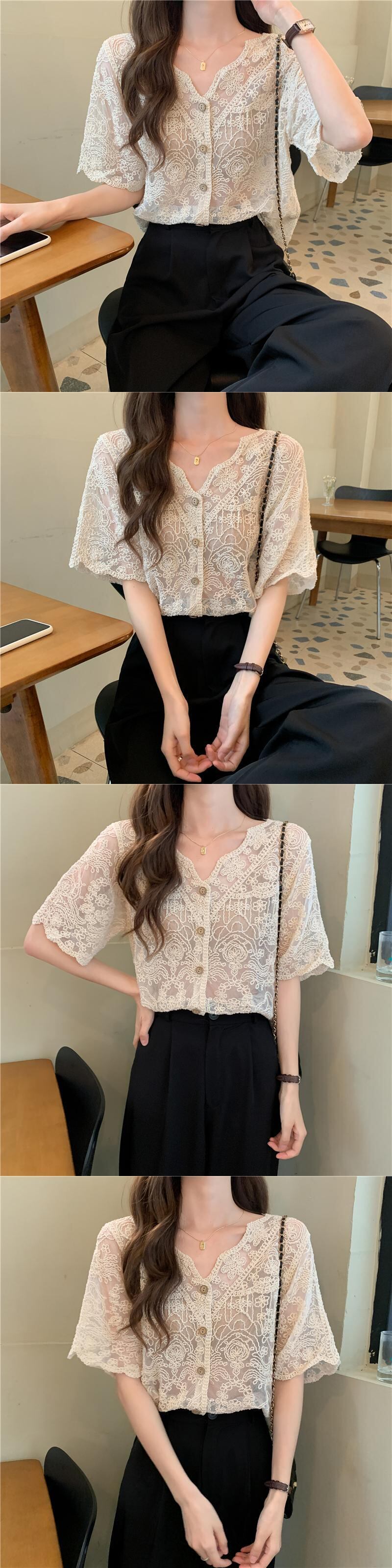 レースシャツ レディース夏服韓国ファッションスタイルルーズVネックカーディガントップス 夏物 Marchs98232578071