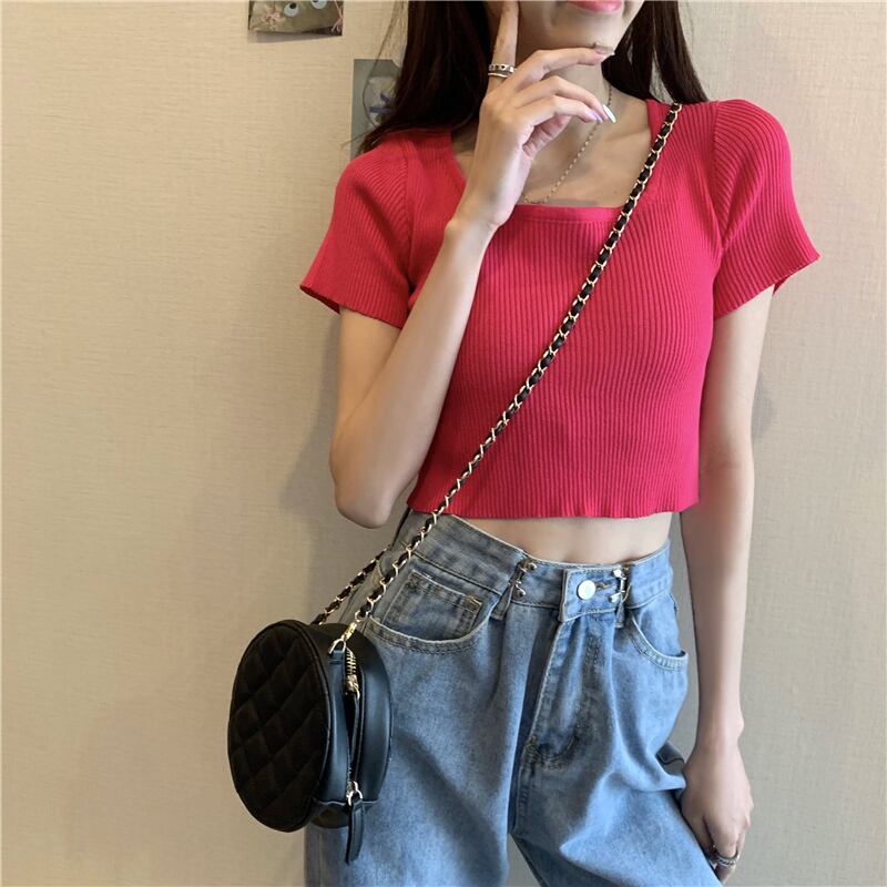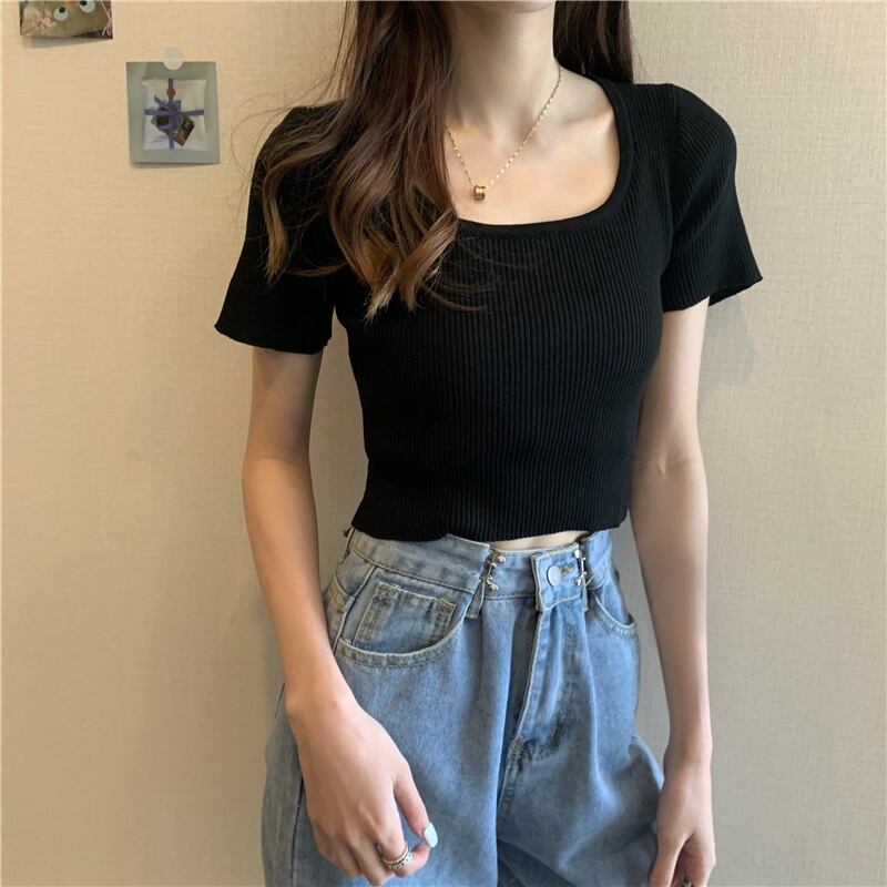 ブラックショートトレンド夏服クロップドニットTシャツレディーストップス 薄手 夏物 Marchs54685449192