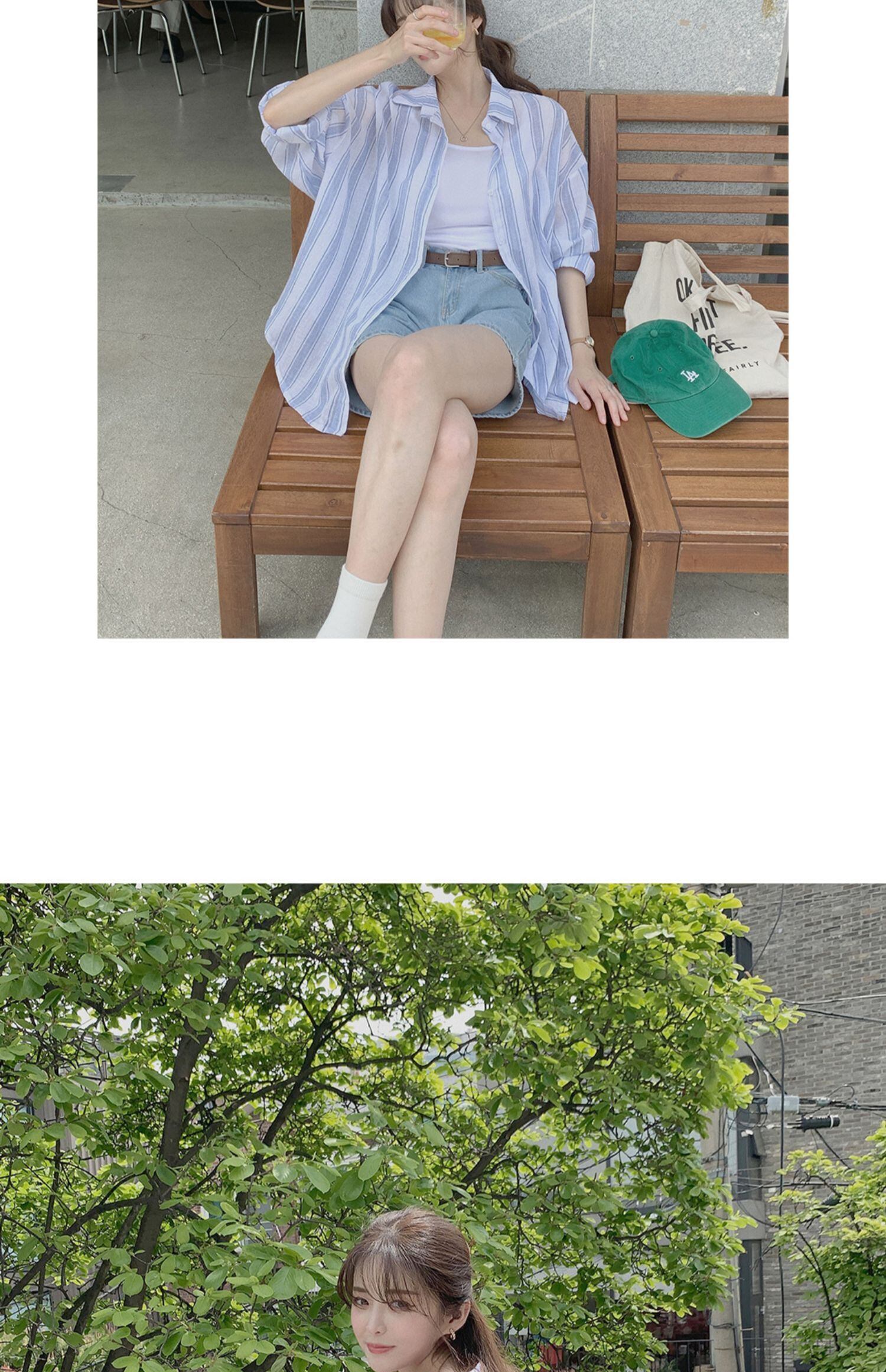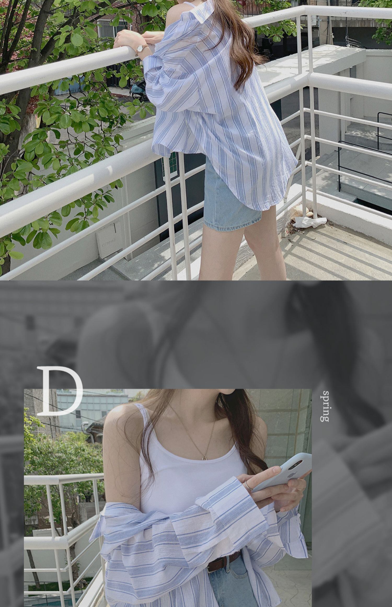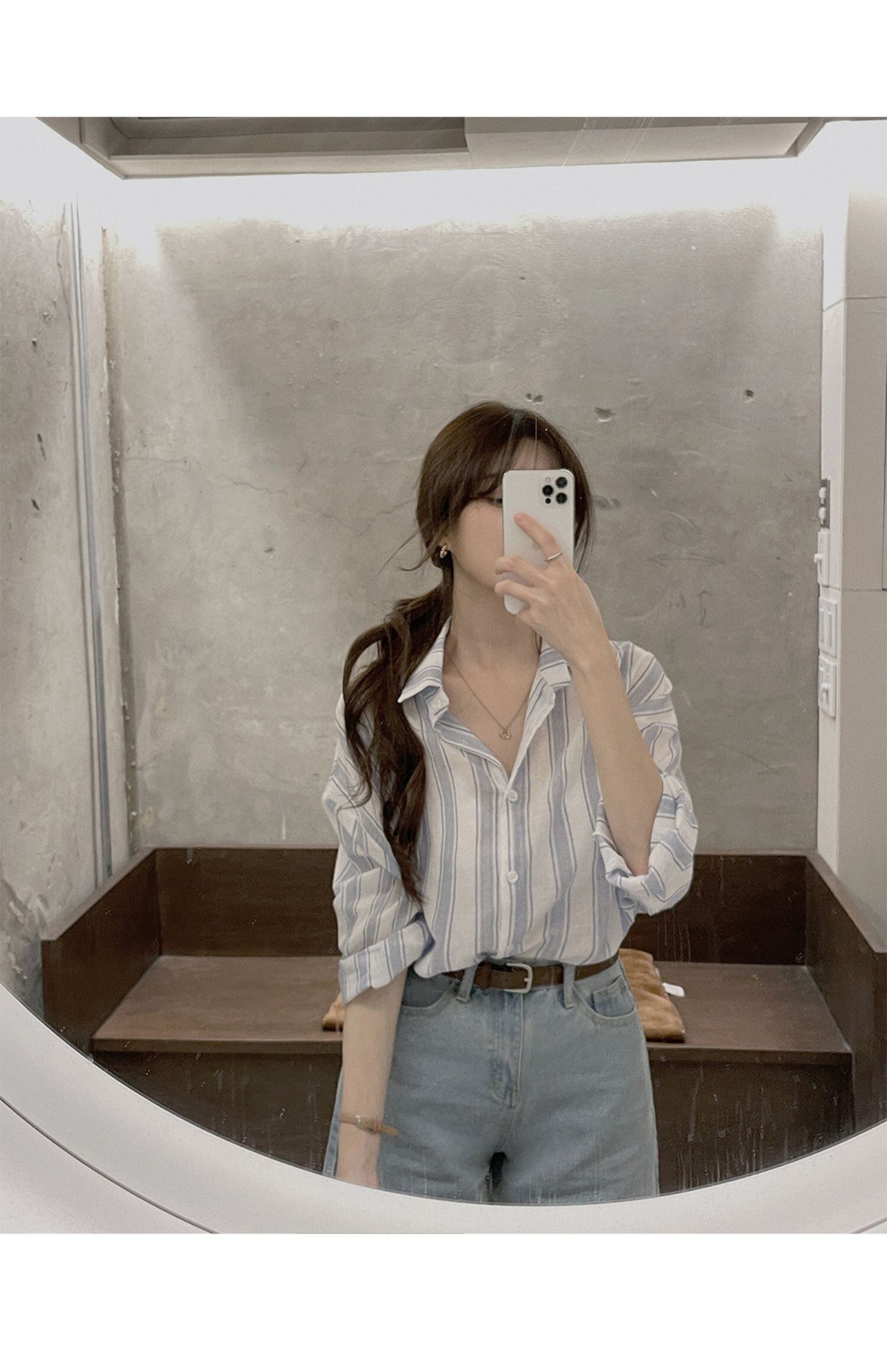 ブルーホワイトストライプシャツ レディース夏服スタイルトップス ロング 夏物 長袖 ミドル丈 Marchs52860613347