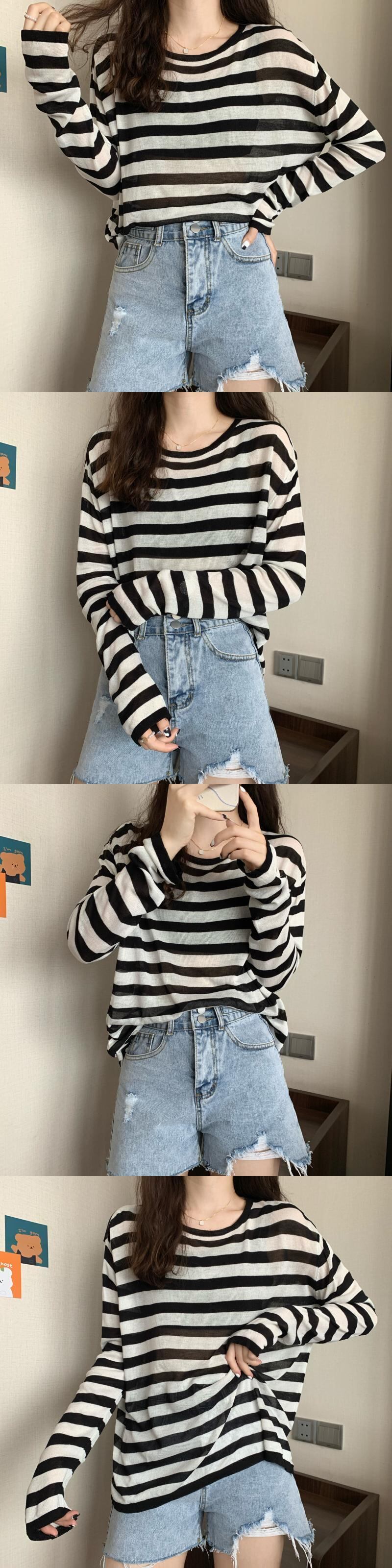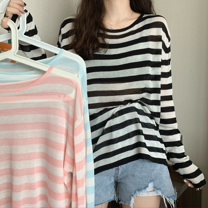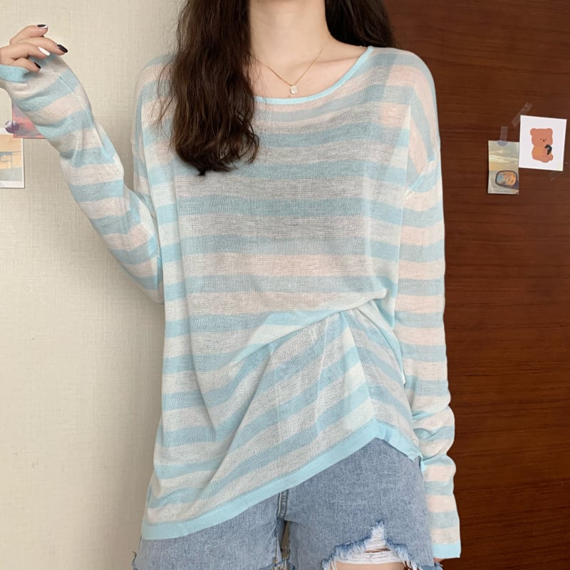 ストライプニットTシャツ夏服薄手トップス ブラウス ロング 夏物 長袖 Marchs814819373
