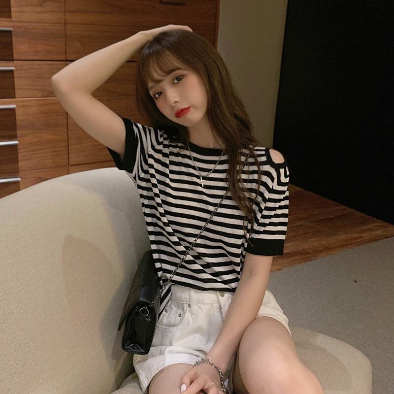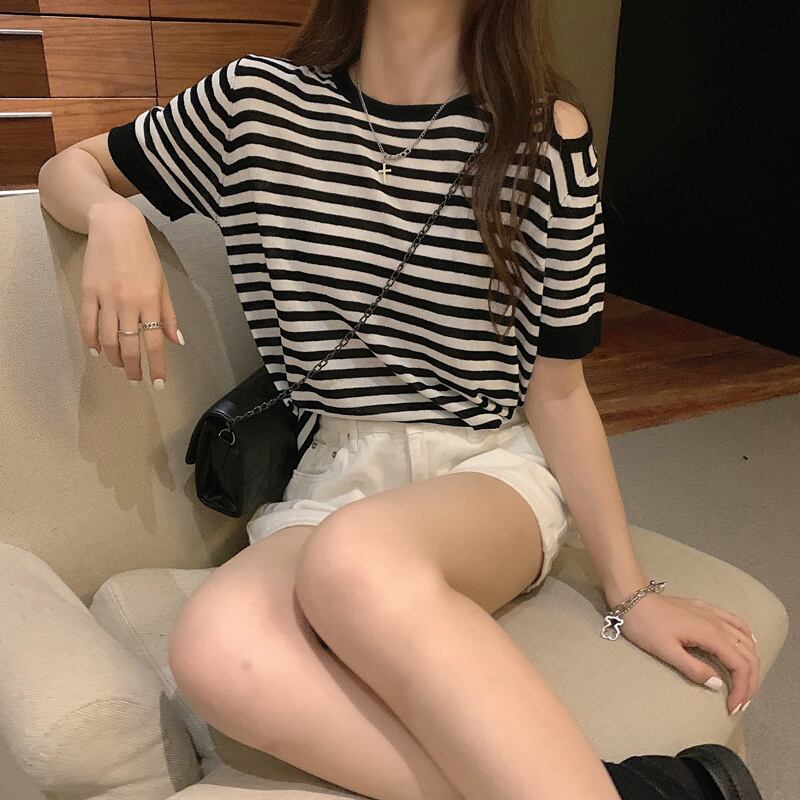 Tシャツレディース夏服薄手ストラップレスルーズスタンダードラウンドネックセーター ストライプトップス レトロ ストリート 夏物 Oネック シルク Marchs52733802074