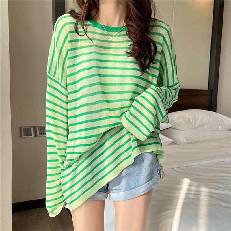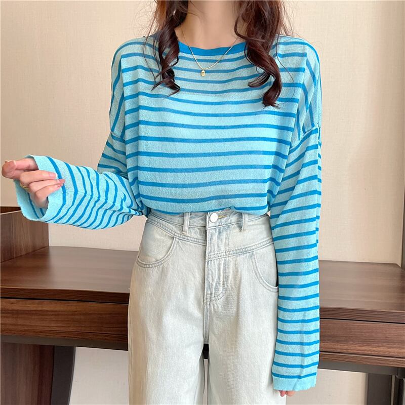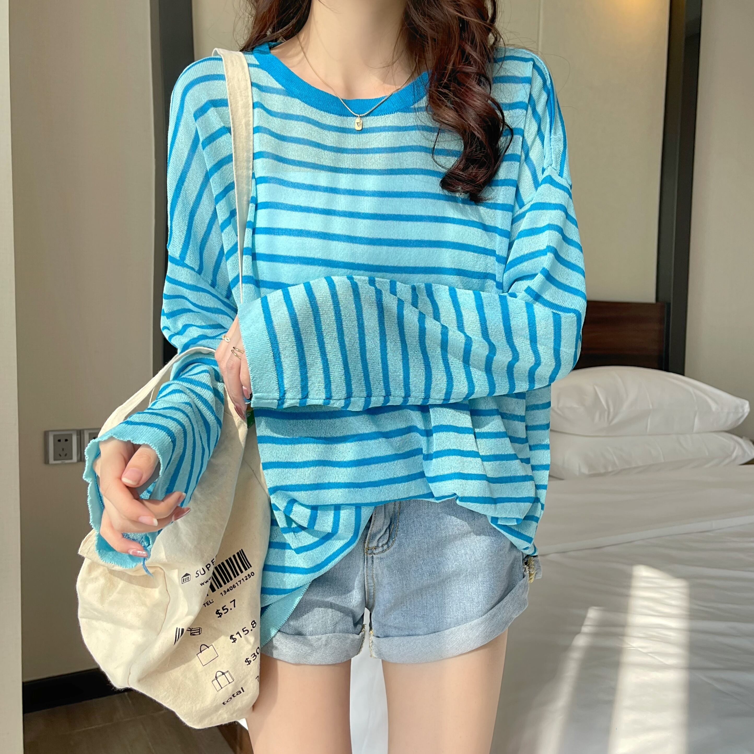 ストライプTシャツ夏服薄手ルーズブラウス ニット ロング 夏物 シルク 長袖 Marchs47308061243