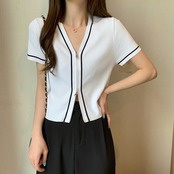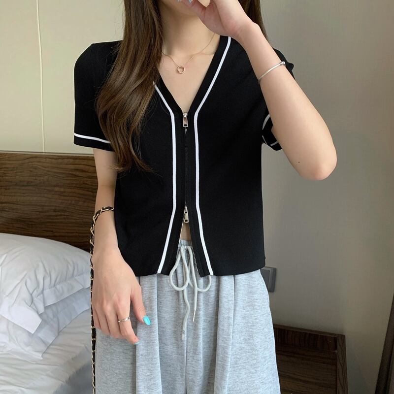 ダブルジッパークロップドトップス ハイウェストウェストパンツ VネックTシャツシャツ レディース夏服ニット 夏物 シルク ウエスト Marchs8258140317