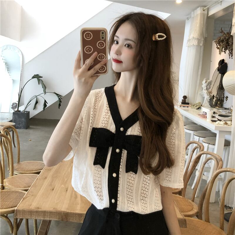 Vネックリボンシャツ 夏服薄手トップス 大人ガーリー スウィート キュート カジュアル 夏物 Marchs16252247207