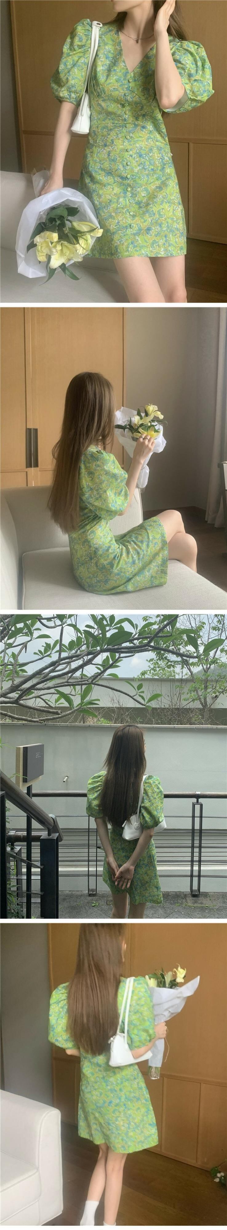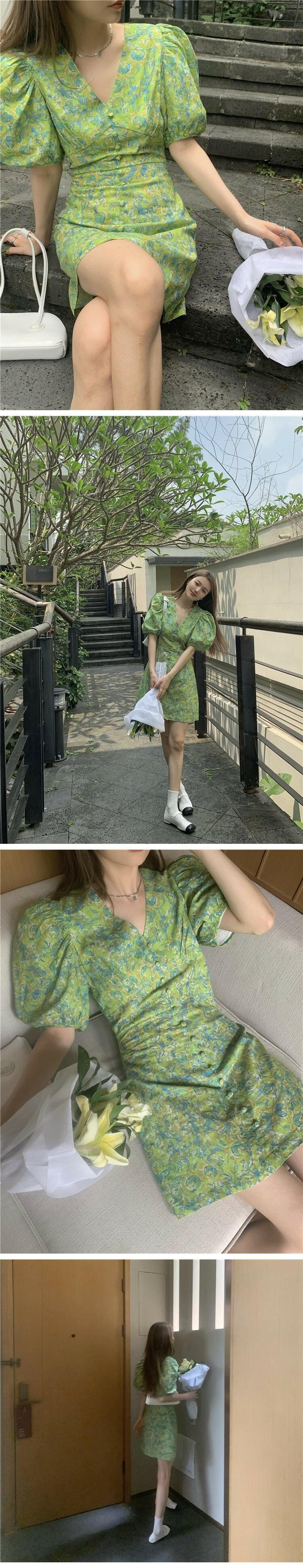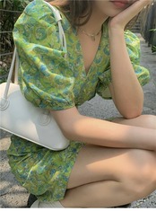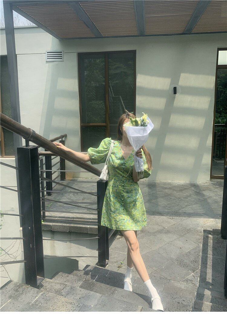 グリーンワンピースレディース夏服スタイルスタンダードVネックスカート レトロ 夏物 コーデ marchs6770983190135