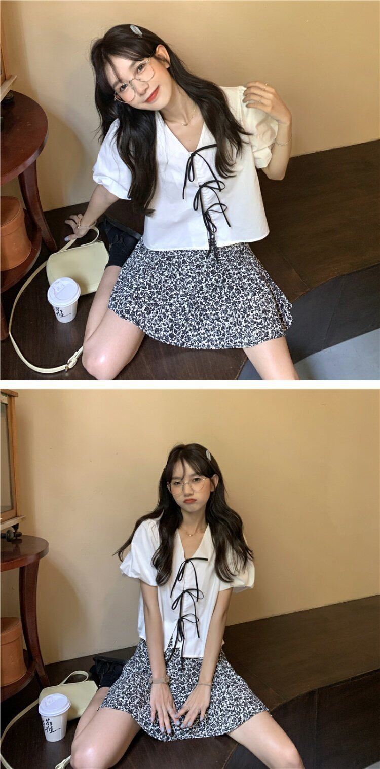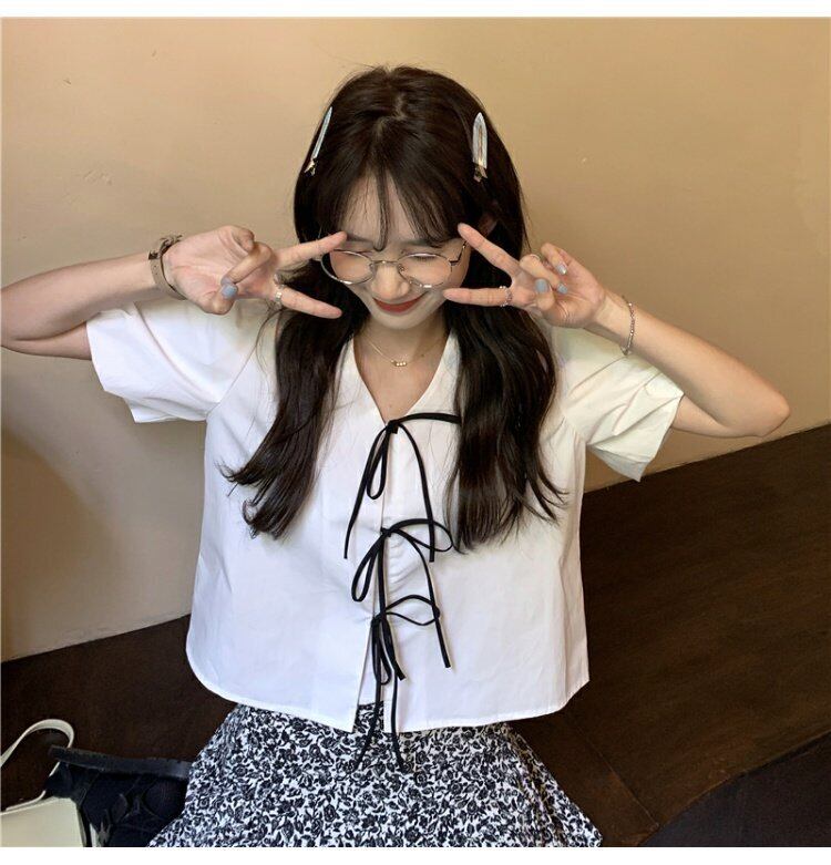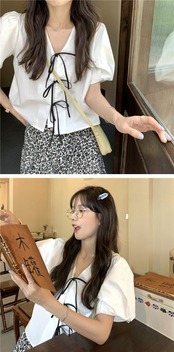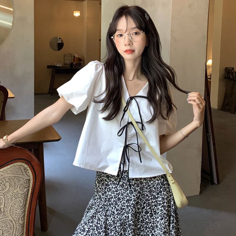 夏服韓国ファッションVネックホワイトトップス スリーブシャツ レディース 夏物 コーデ marchs6793628255272