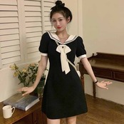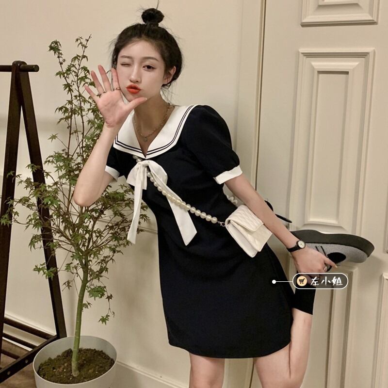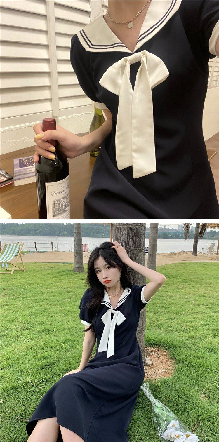 夏服スタンダードリボンネイビーカラーウェストスリーブワンピースレディース レトロ 夏物 ウエスト コーデ marchs6777386445273
