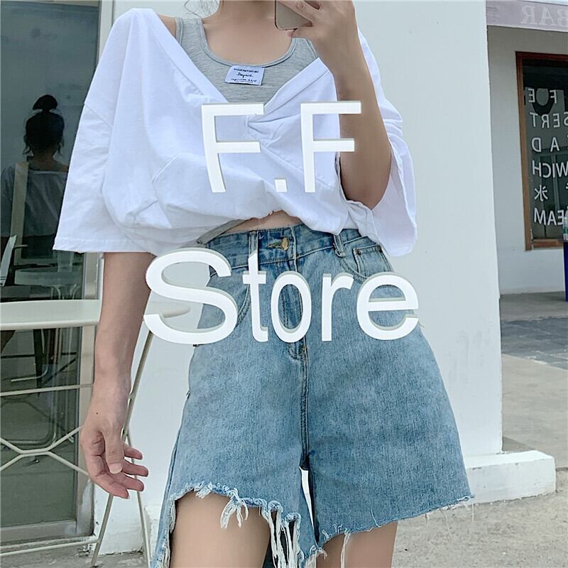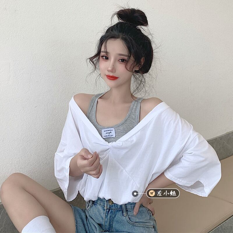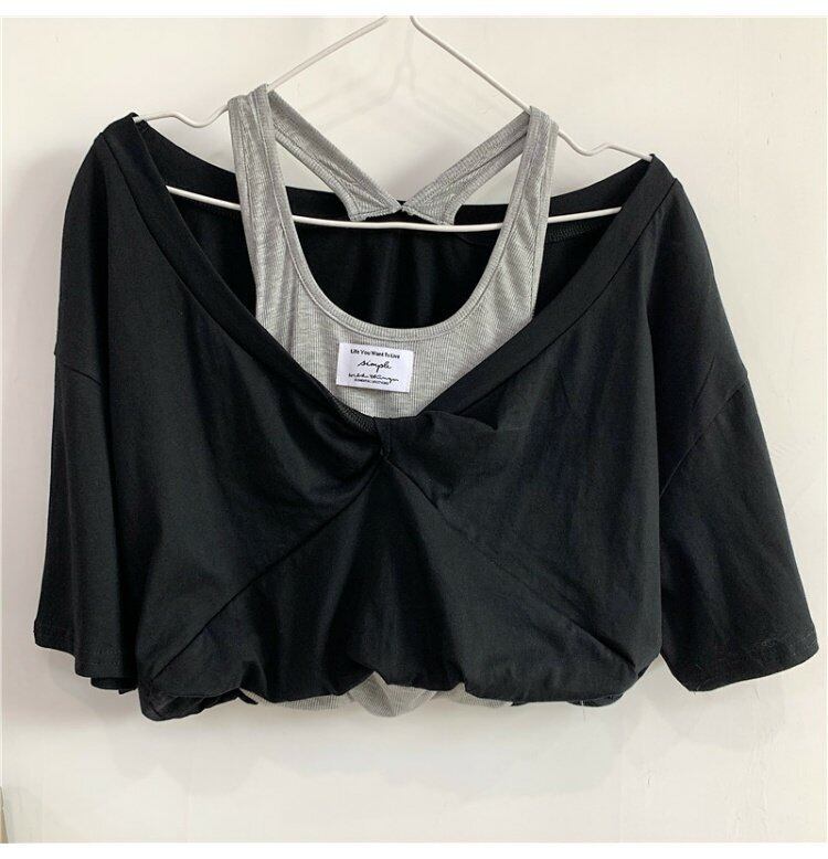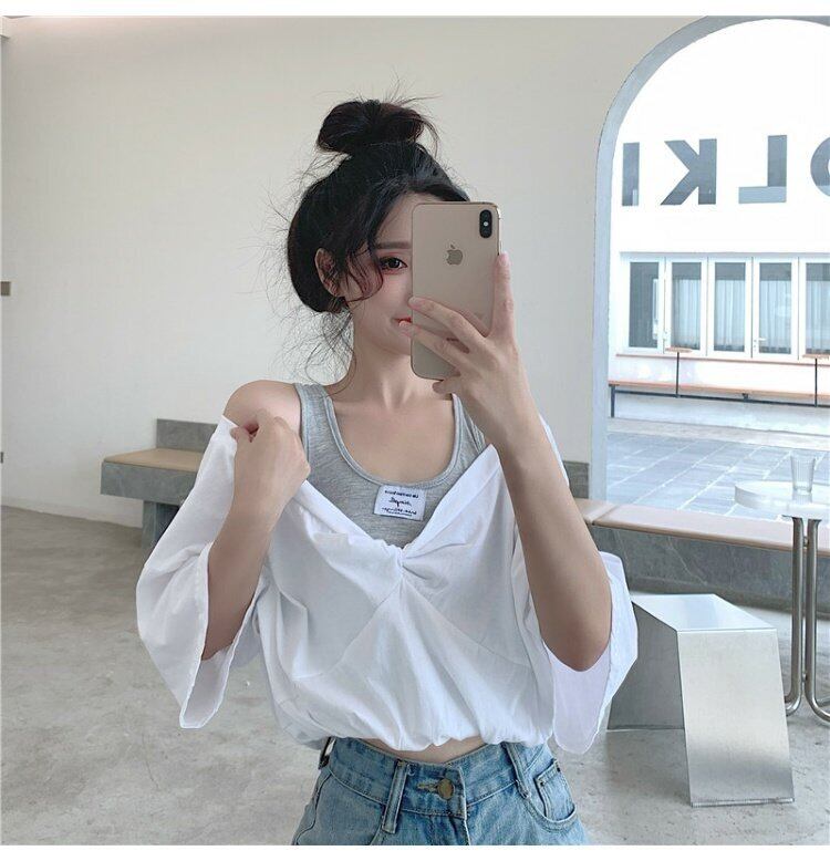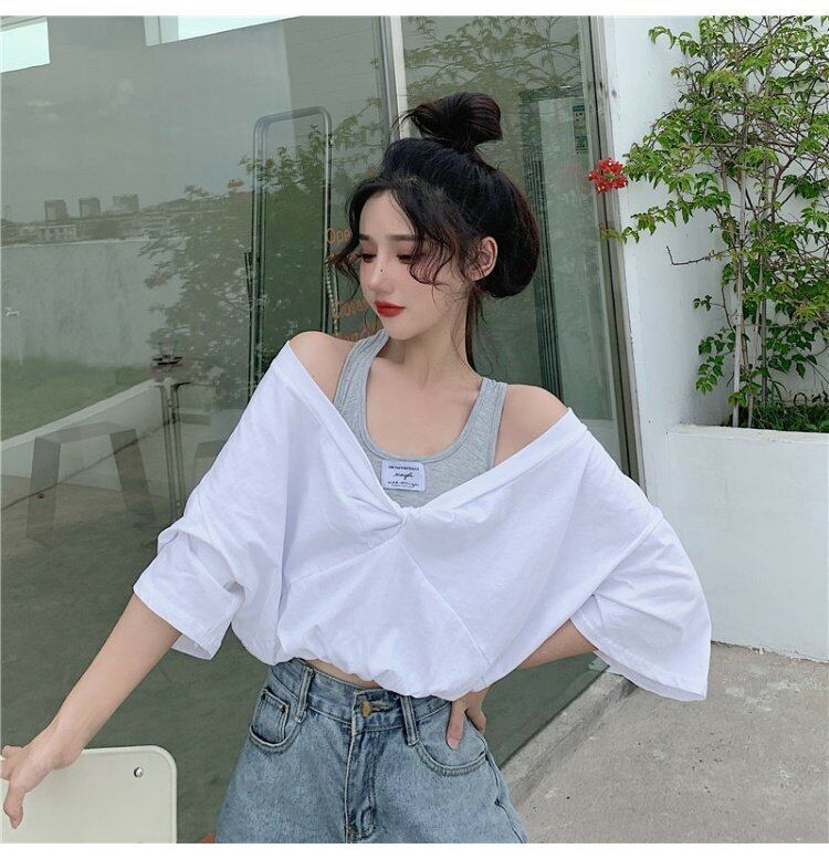 ツーピース ショートトップス ホワイトTシャツシャツ レディース夏服ルーズ 夏物 ステッチ コーデ marchs6798097931002