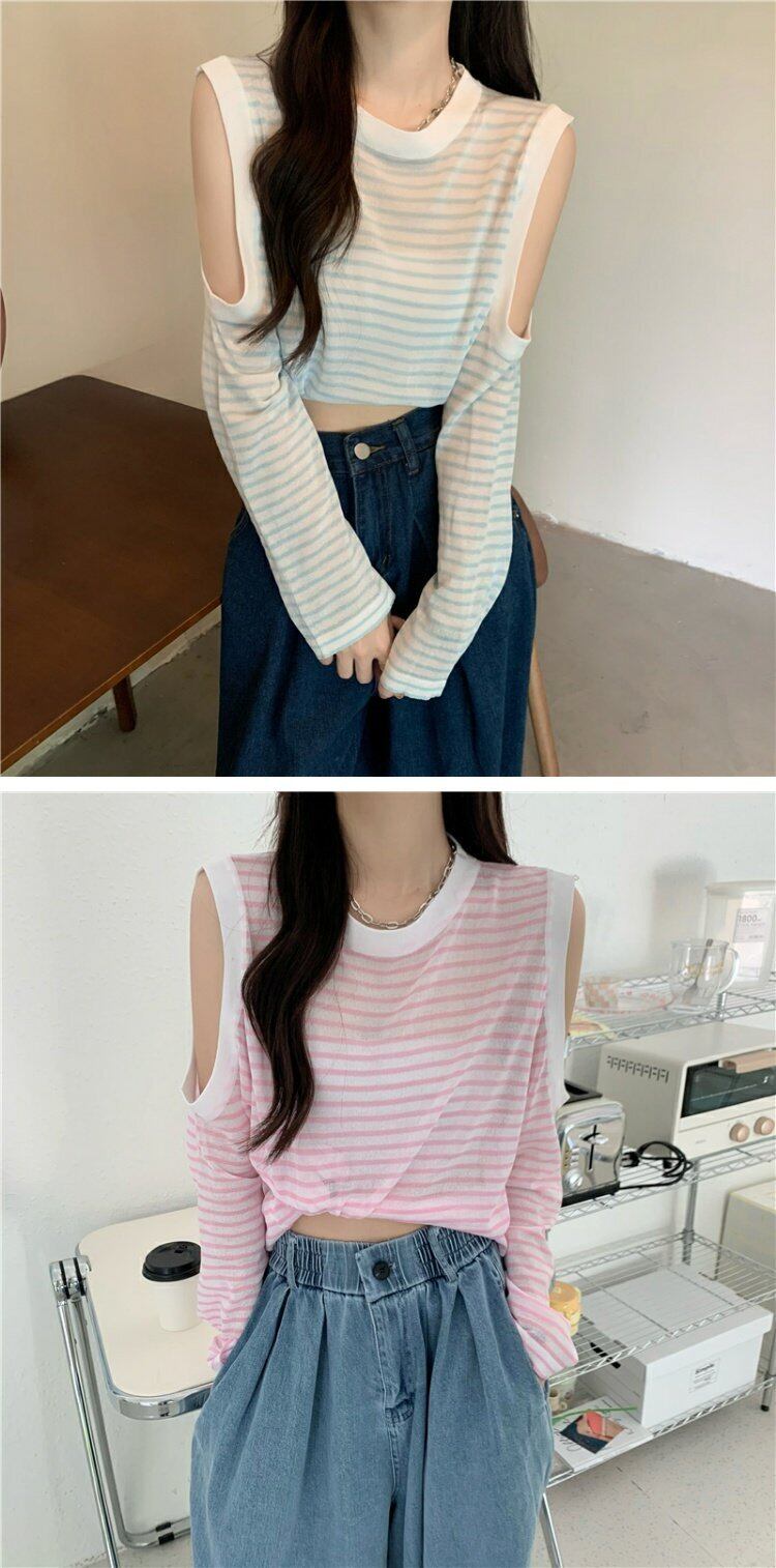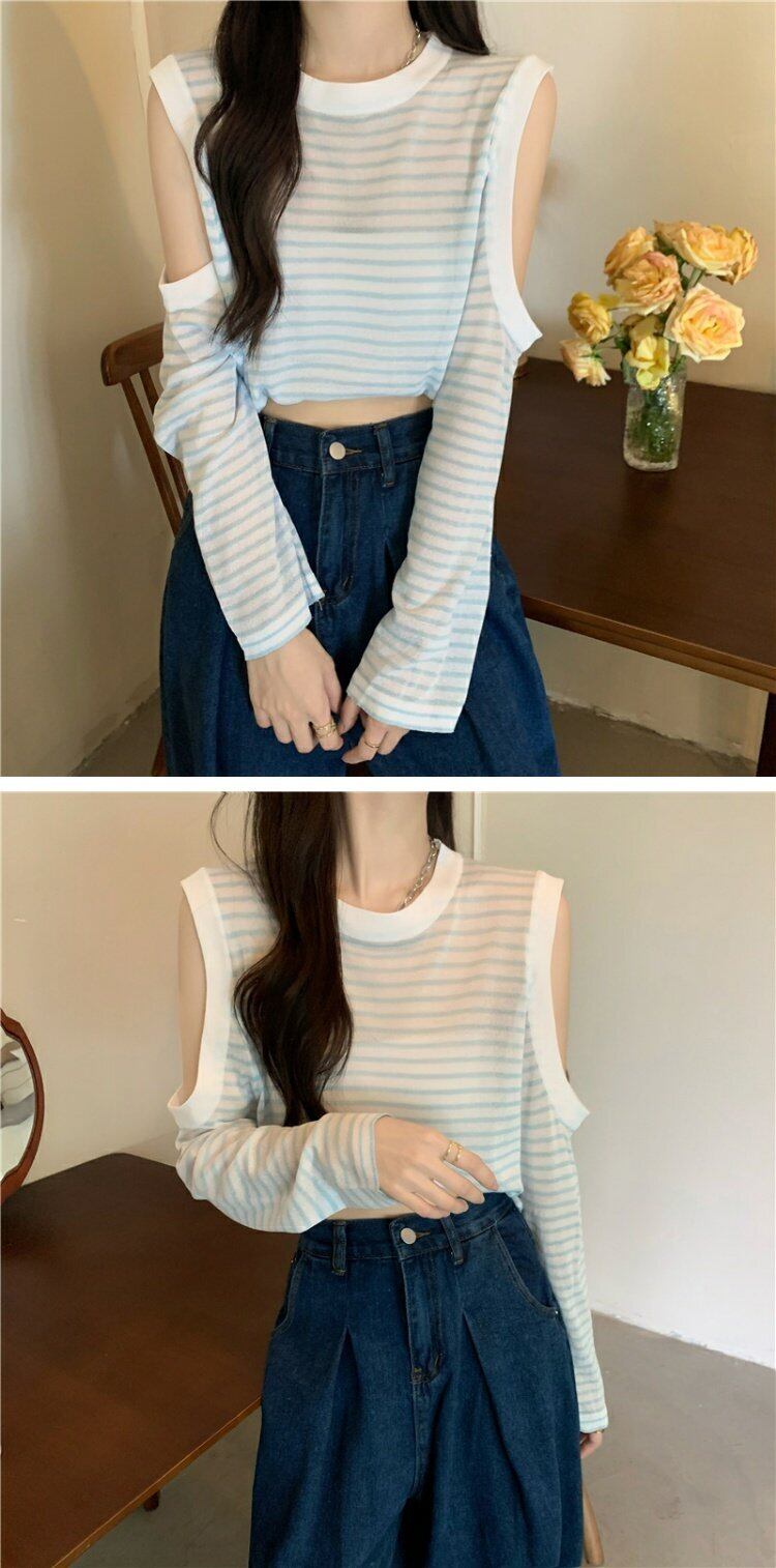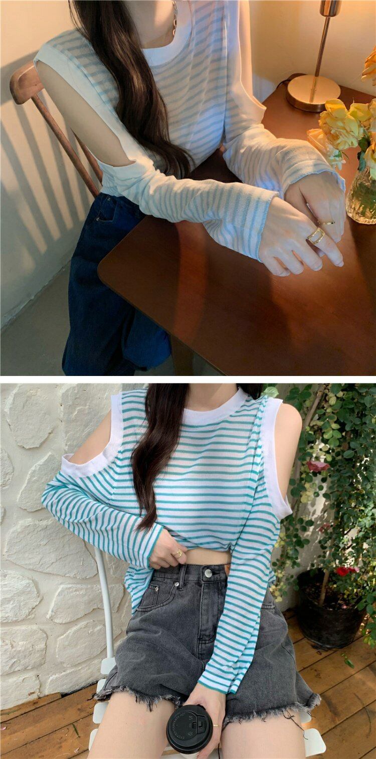 夏服ルーズ薄手ストライプトップス 韓国ファッションラウンドネックTシャツレディース ロング 夏物 Oネック オフショルダー 長袖 コーデ marchs6712818022757