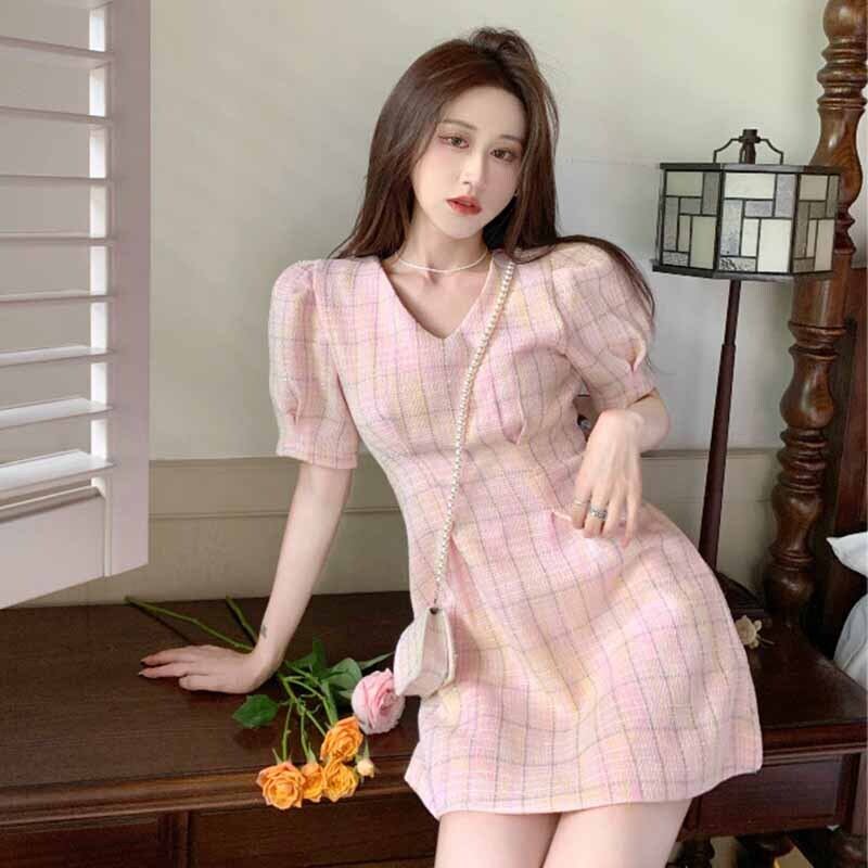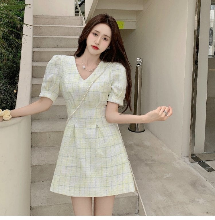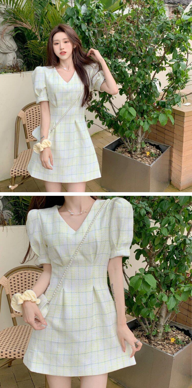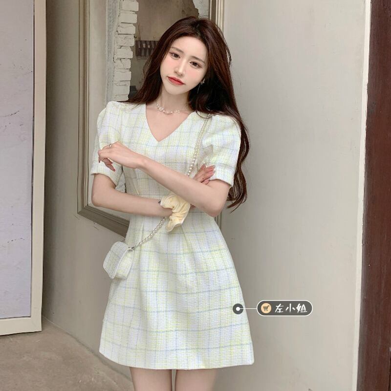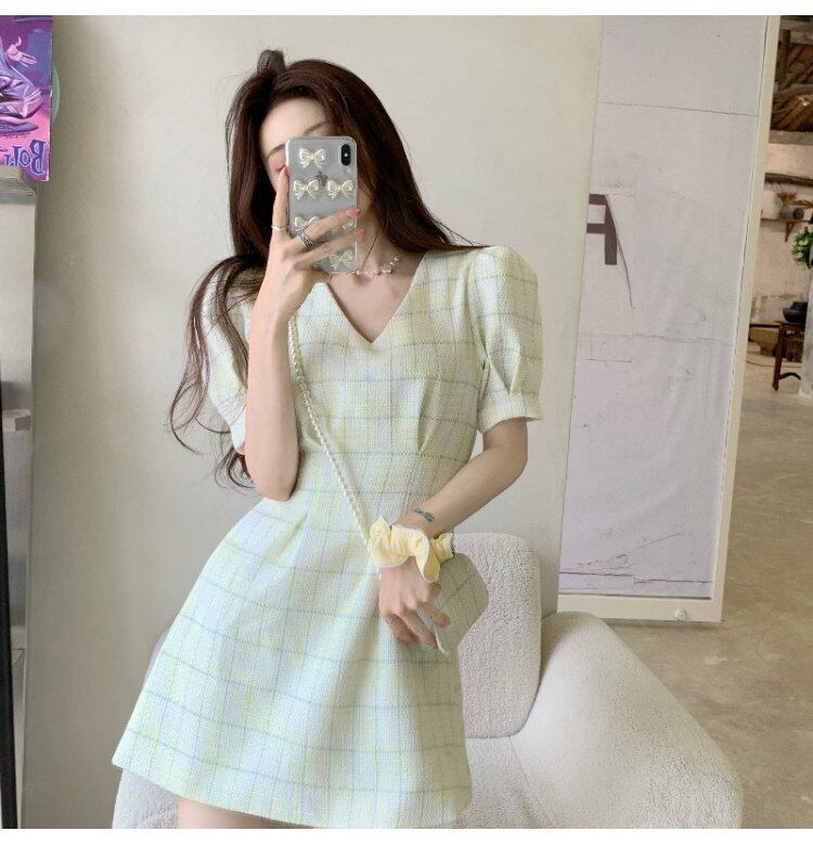 スタンダード格子柄Vネックワンピースレディース夏服スタイルウェストスカート レトロ 夏物 ウエスト コーデ marchs6715042293688