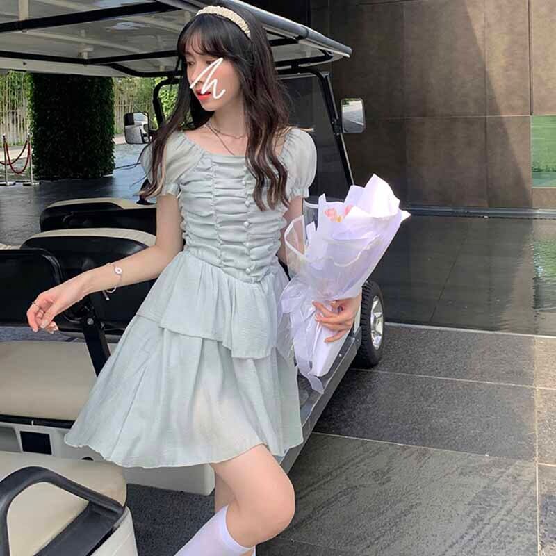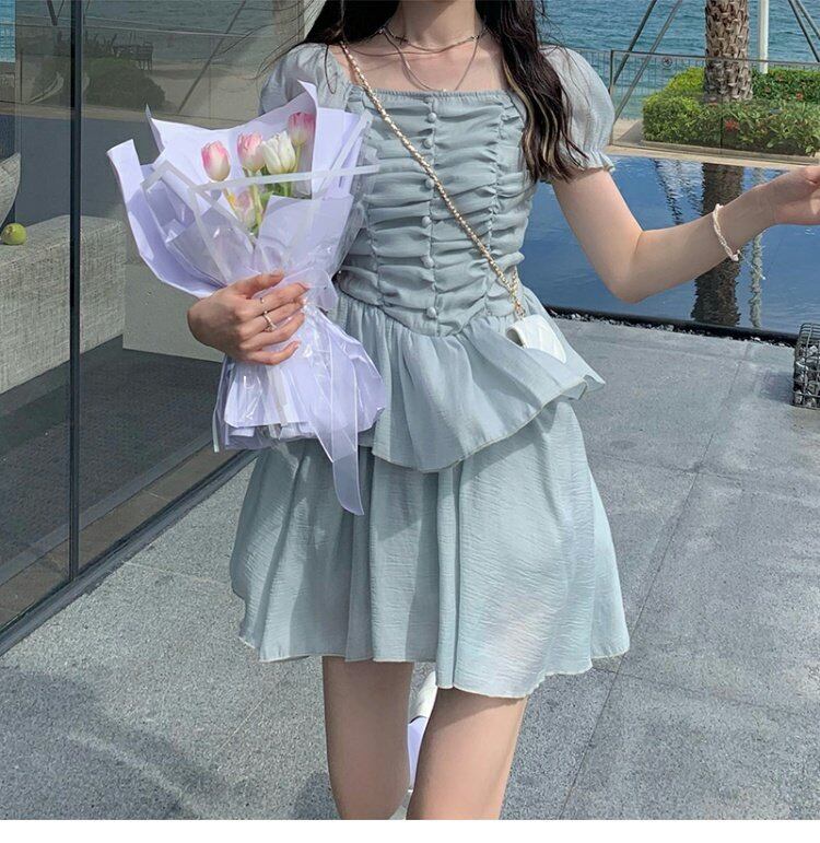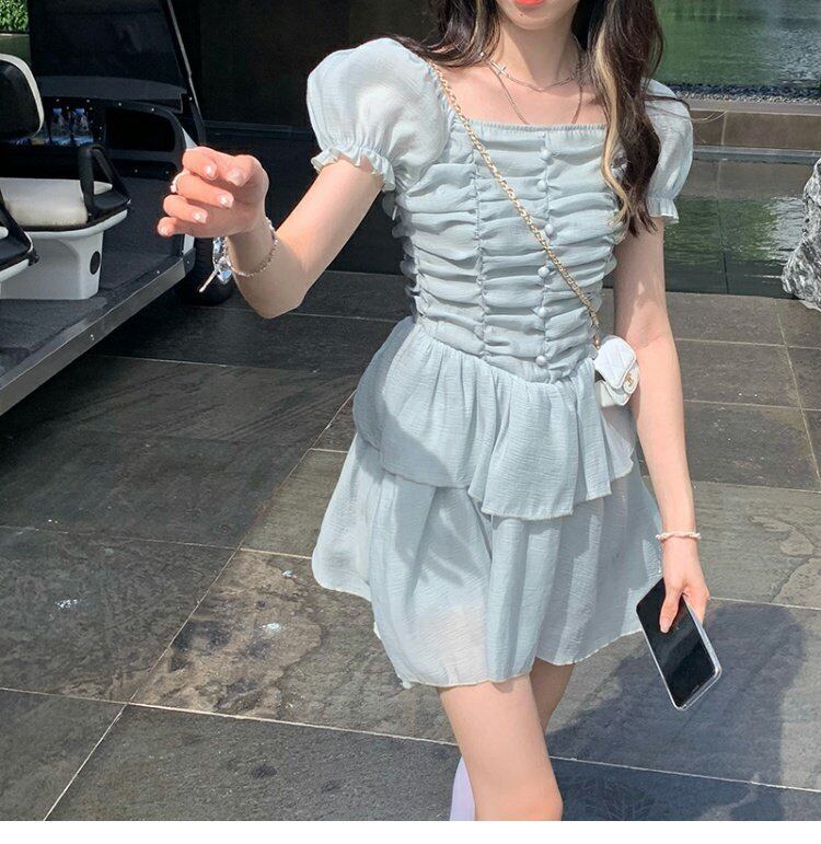 韓国ファッションワンピースレディース夏服ウェストダブルスカート 大人ガーリー スウィート キュート カジュアル 夏物 スクウェア ウエスト コーデ marchs6711703725764