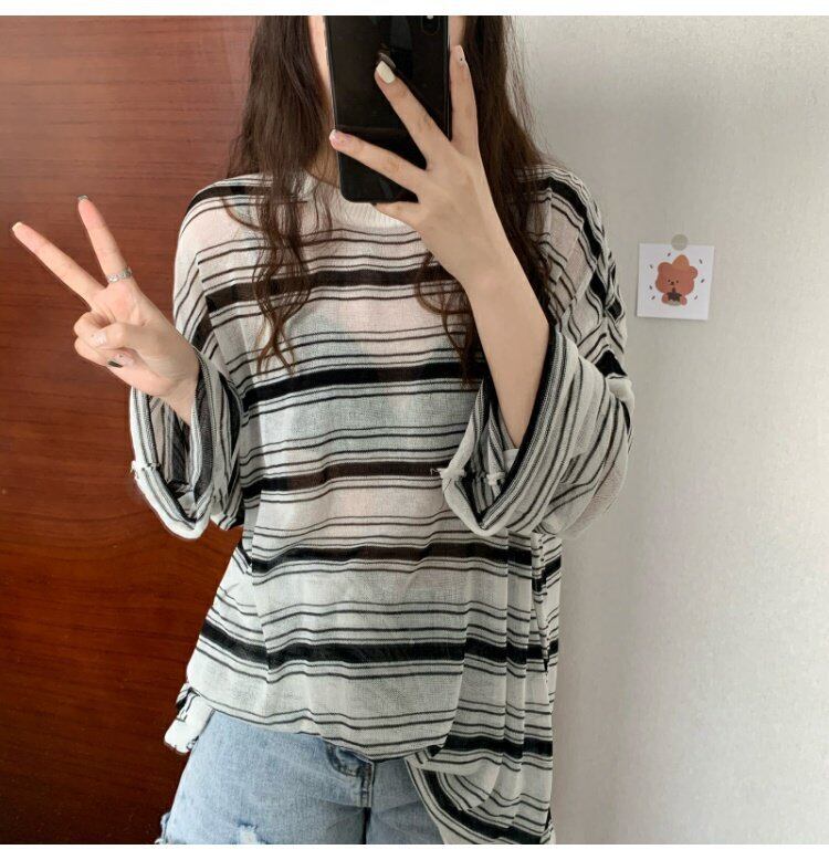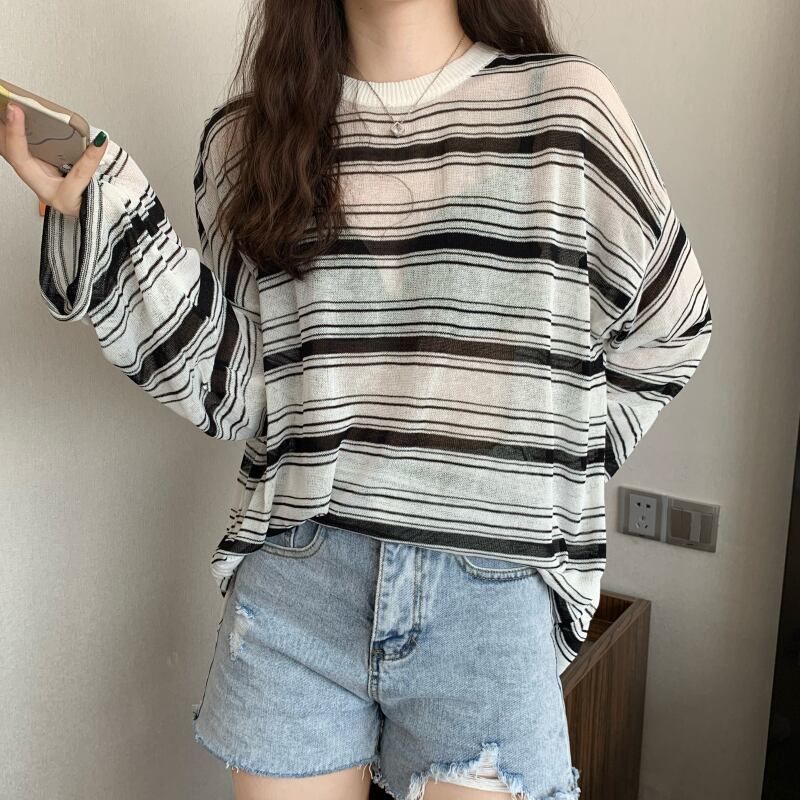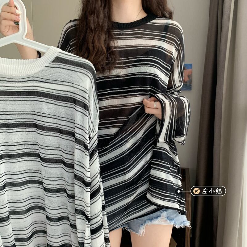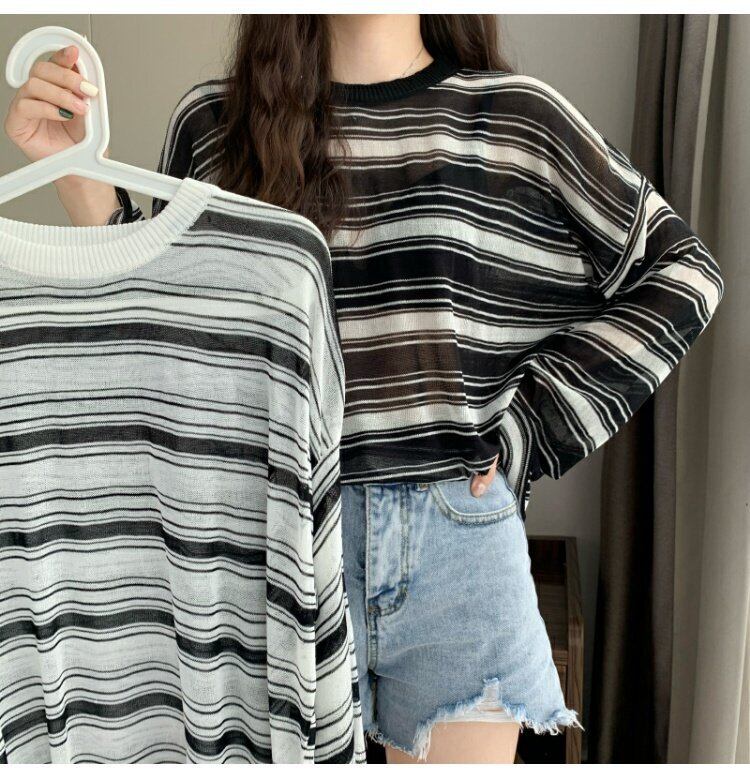 夏服韓国ファッショントレンドルーズストライプ薄手ニットトップス Tシャツレディース ロング 夏物 スタイル 長袖 コーデ marchs6793328575276